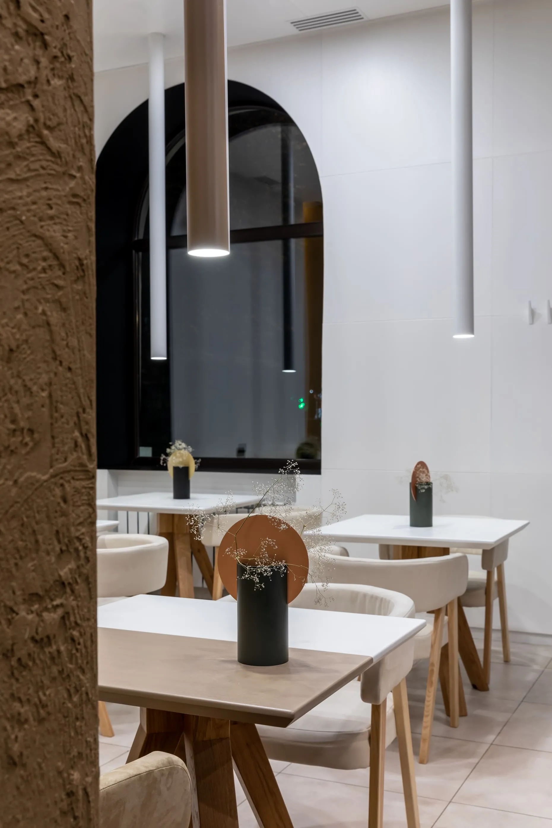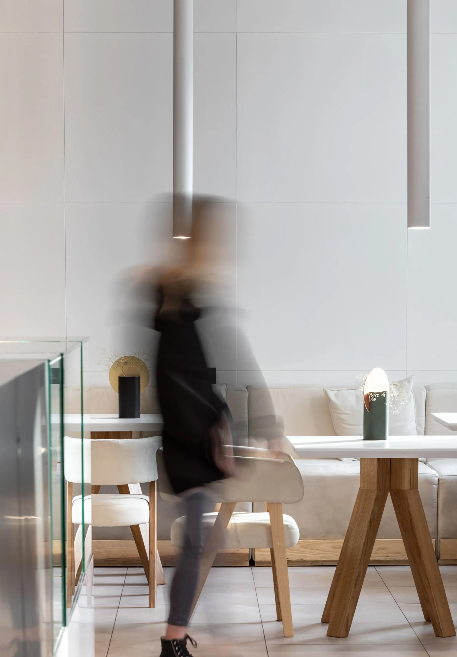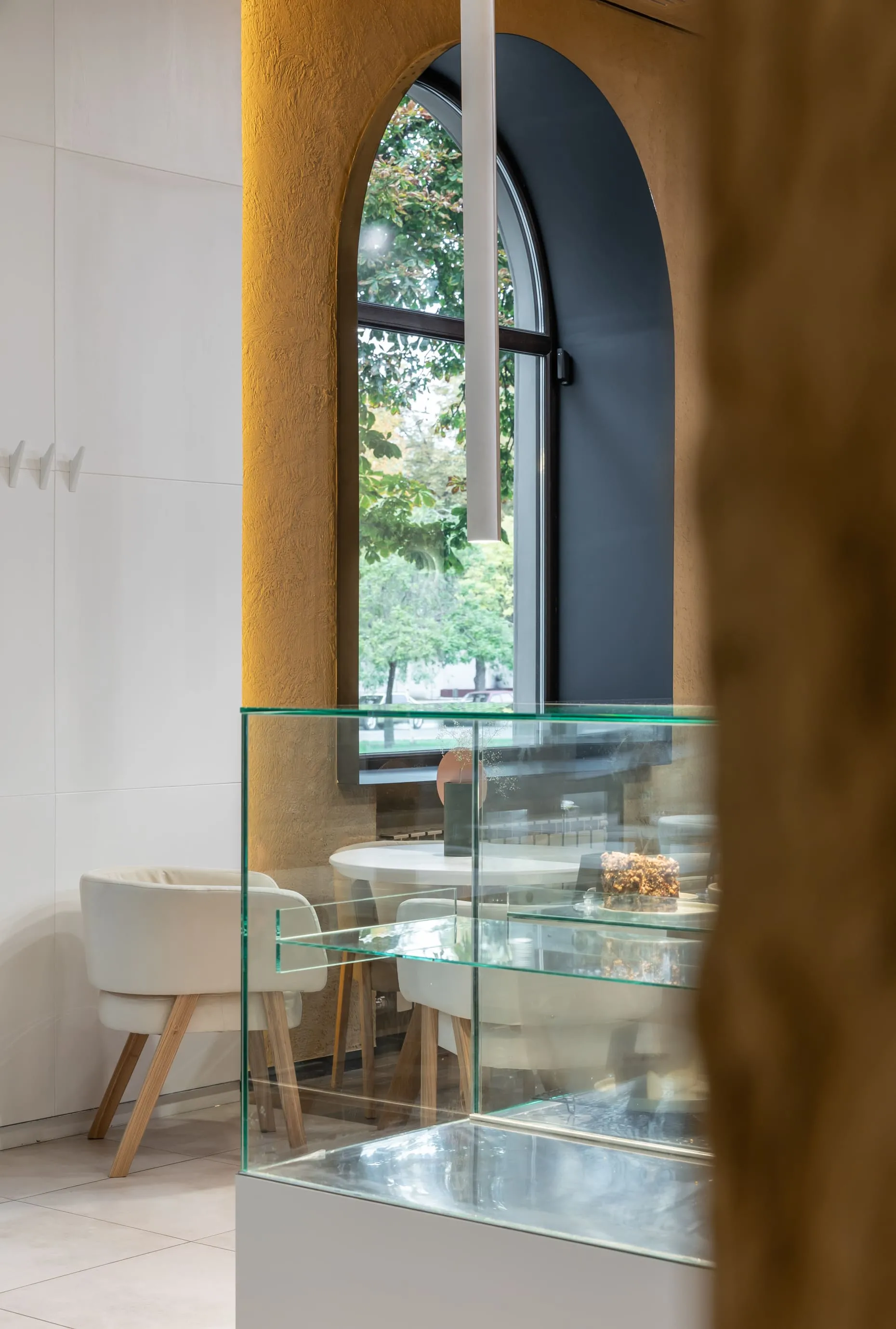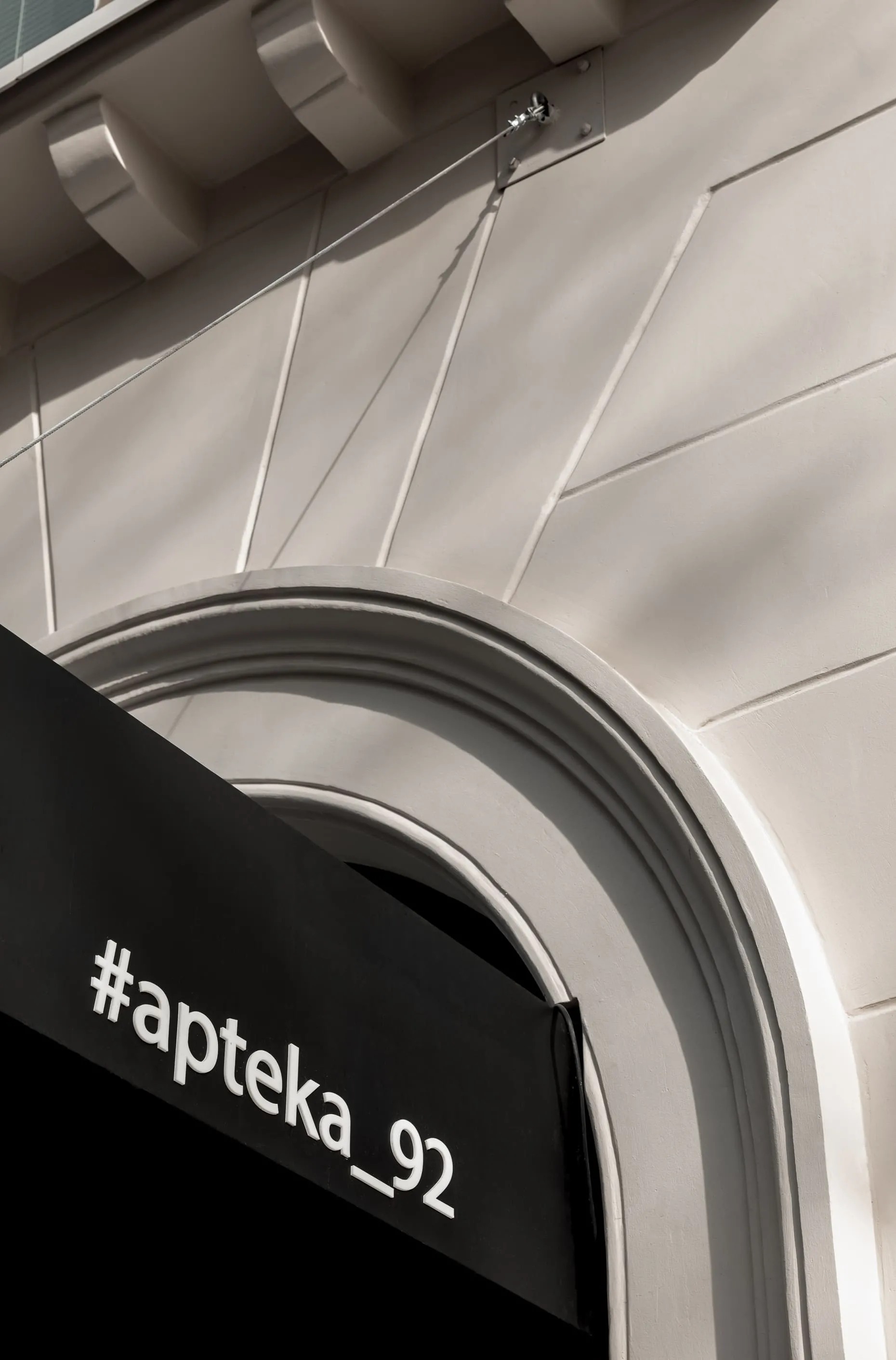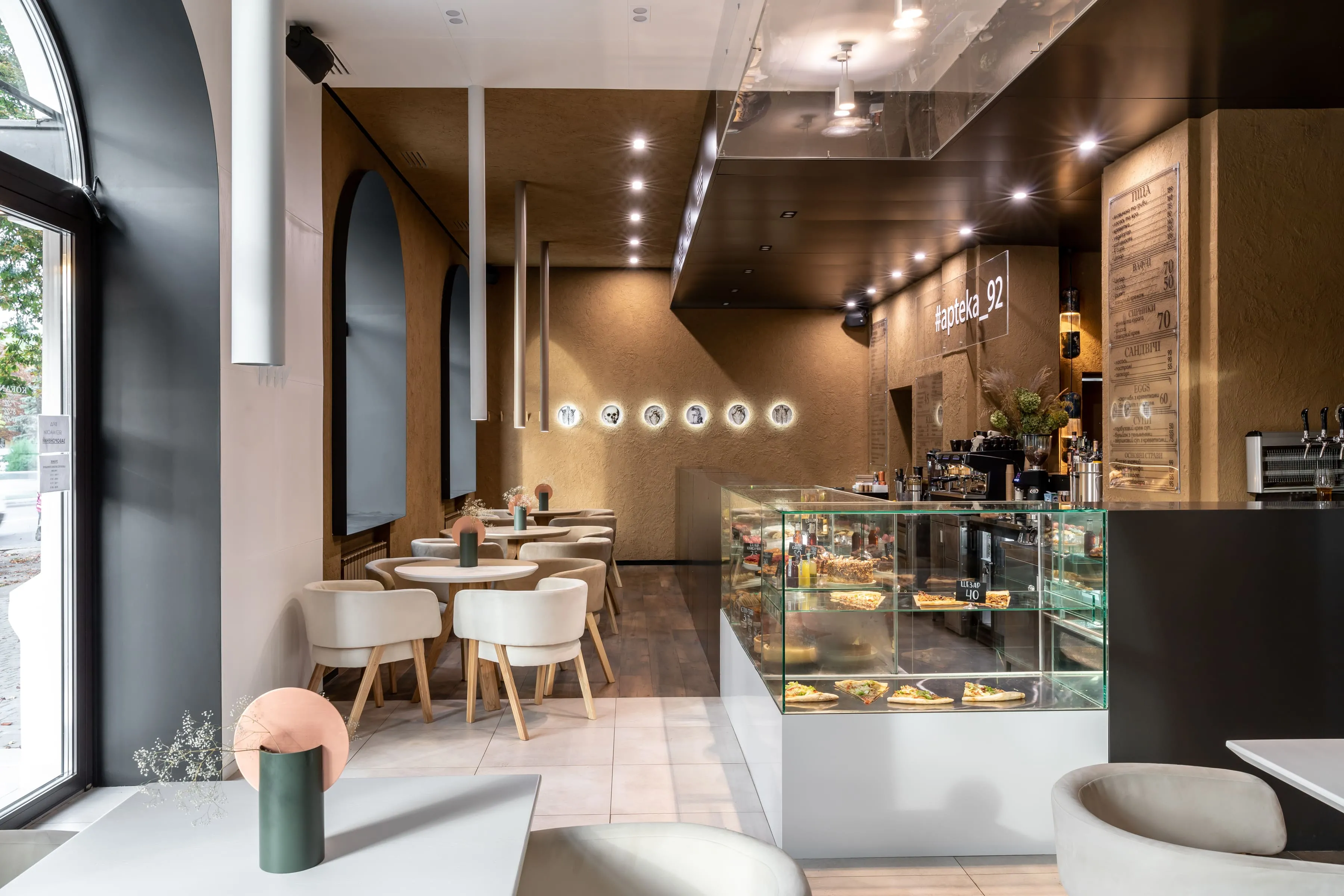 Інтер’єр кав’ярні — як заспокійливе. Тут домінують два кольори: чистий білий, який резонує з історією місця, та світло-коричневий колір глини, який доповнюється металевою барною стійкою. Межі обробки стелі переходять на підлогу, світильник, диван та стільці, утворюючи ідеальний прямокутник, який в інтер’єрі з’являється у вигляді скляної конструкції на стелі та вітрини-холодильника на барі. Минуле та майбутнє об’єдналися в «тут і зараз» під назвою Apteka_92.