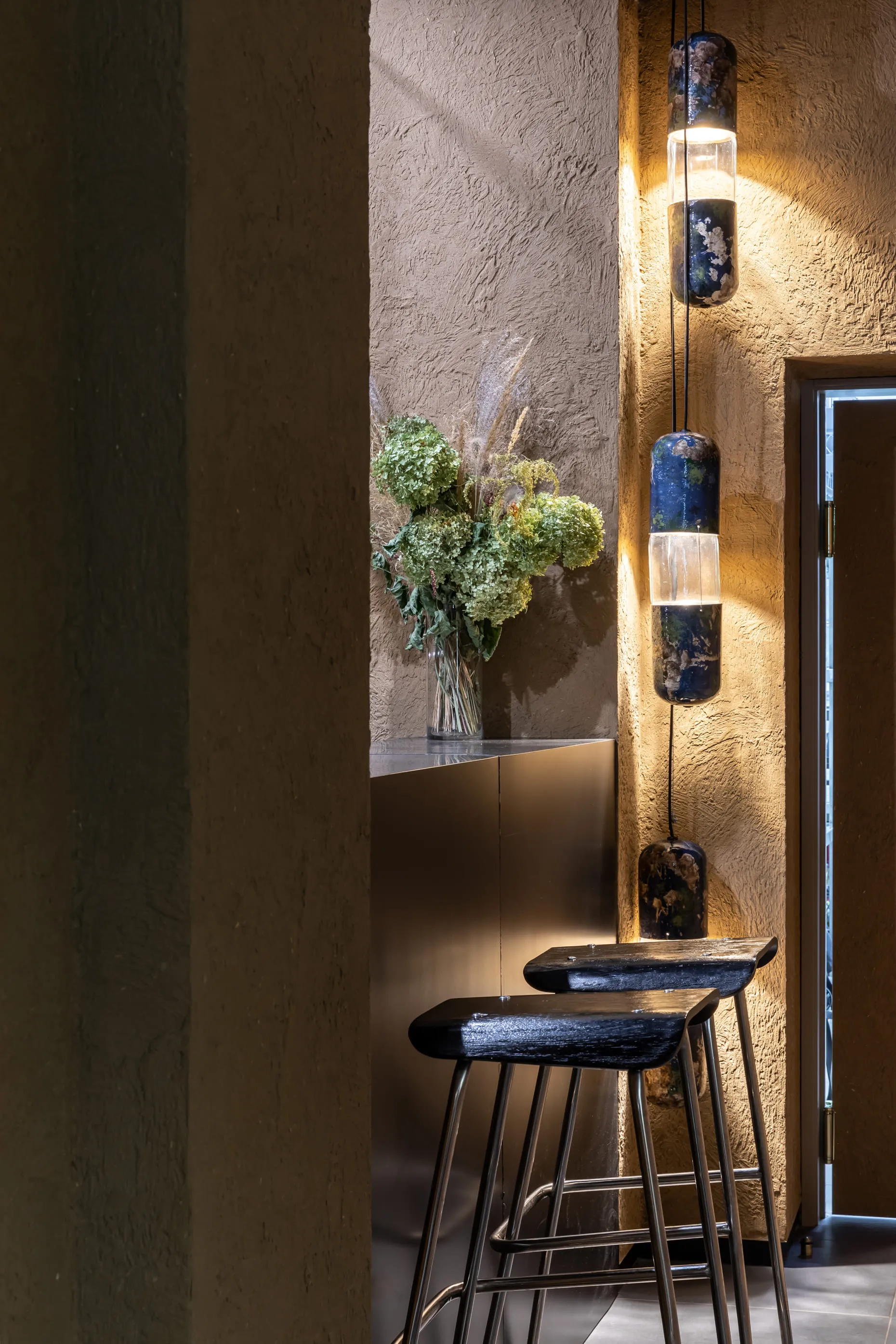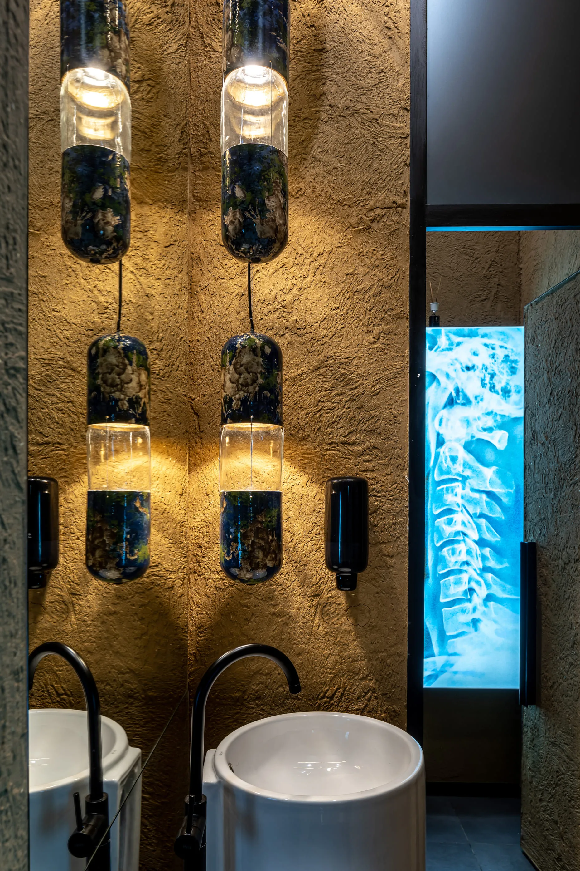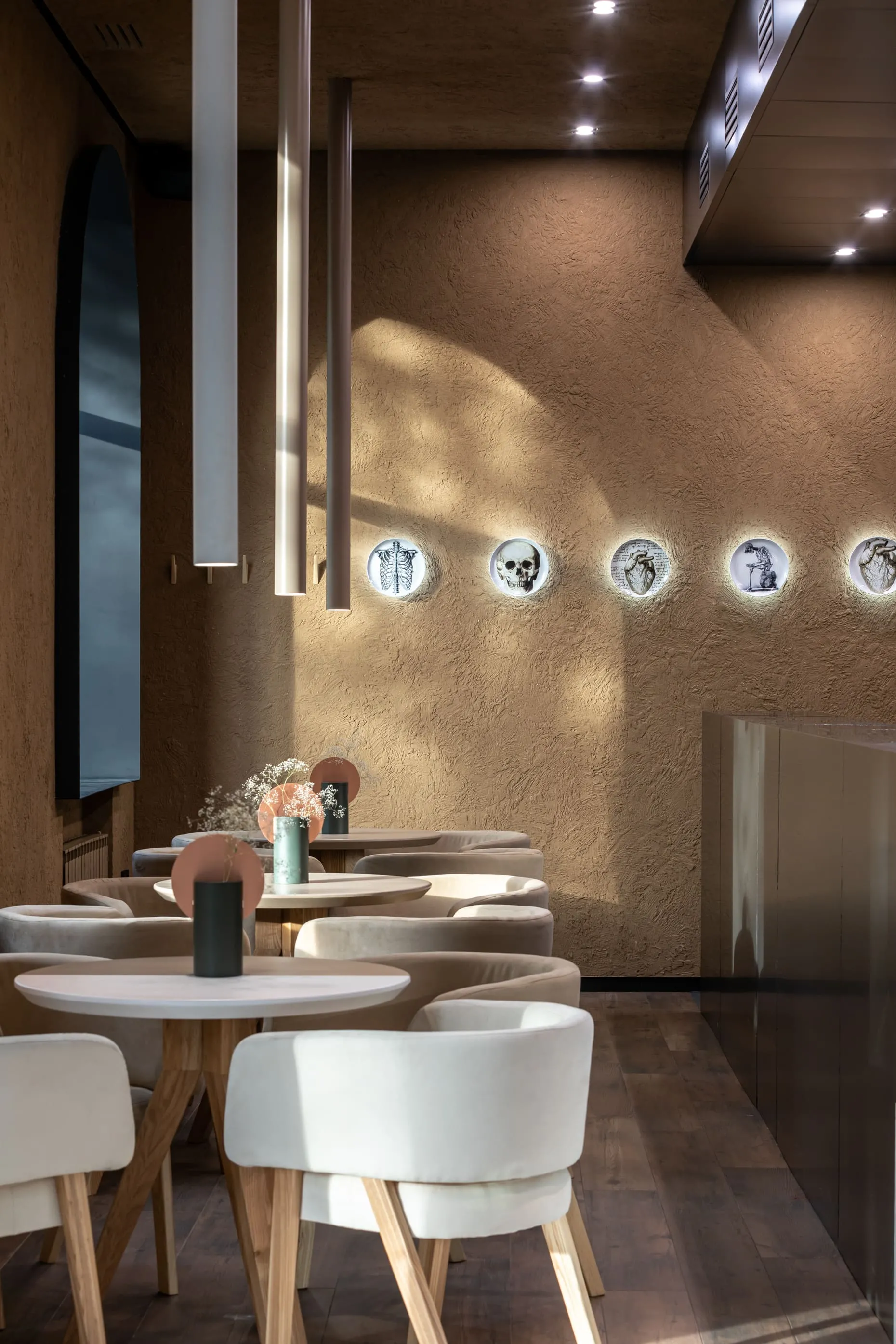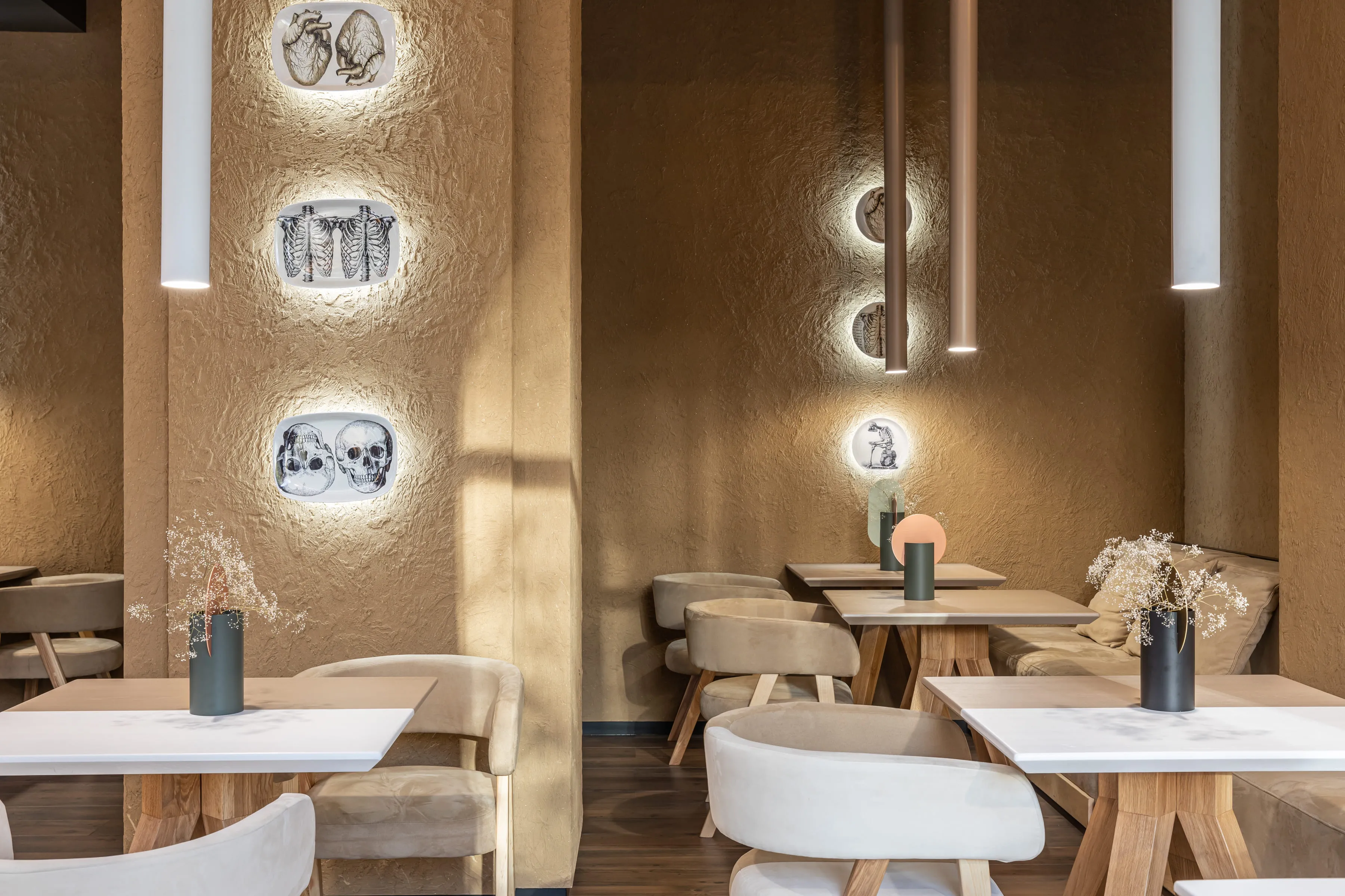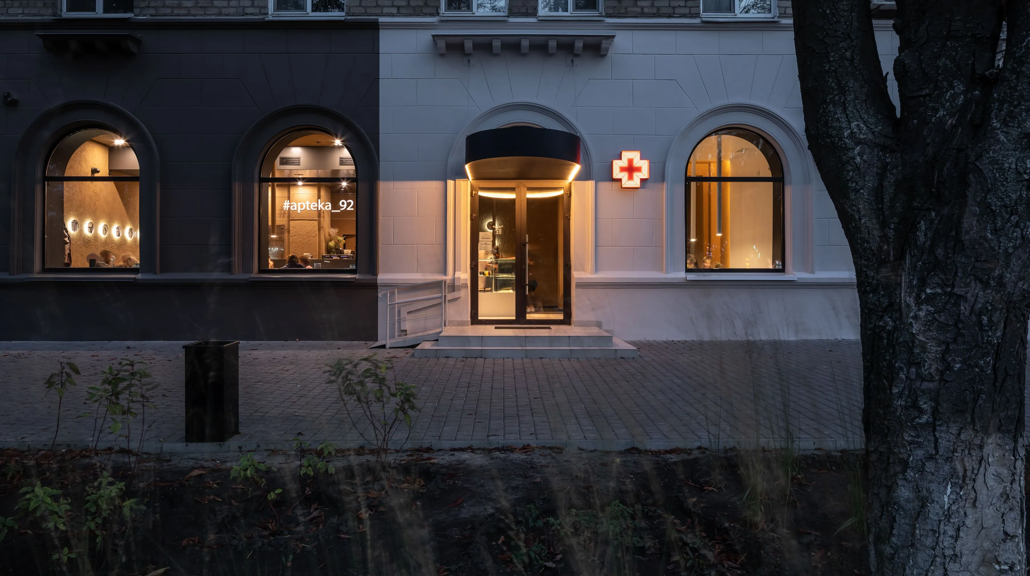 «Раніше тут була справжня аптека, яка працювала років 20. Ми вирішили не ламати звичне сприйняття місця для тих, хто живе поруч, та залишили назву й стару аптечну тематику. Так на стінах з’явилися тарілки з анатомічними малюнками, керамічні пігулки та рентген у вбиральні. Цікаво, що фасад не видає новий заклад: зовні це просто оновлена аптека», — розповідає архітектор проєкту Віктор Захарченко. Декоративні елементи інтер’єру нагадують про те, що було «до» нашої кав’ярні. Попід стелею — авторські світильники Сергія Махно Vitamin M, а стіни закладу прикрашають тарілки з малюнками скелету людини, які слугують додатковим освітленням. Але не хвилюйтесь, ці скелети гостей лякати не будуть — лише розповідатимуть свої історії.