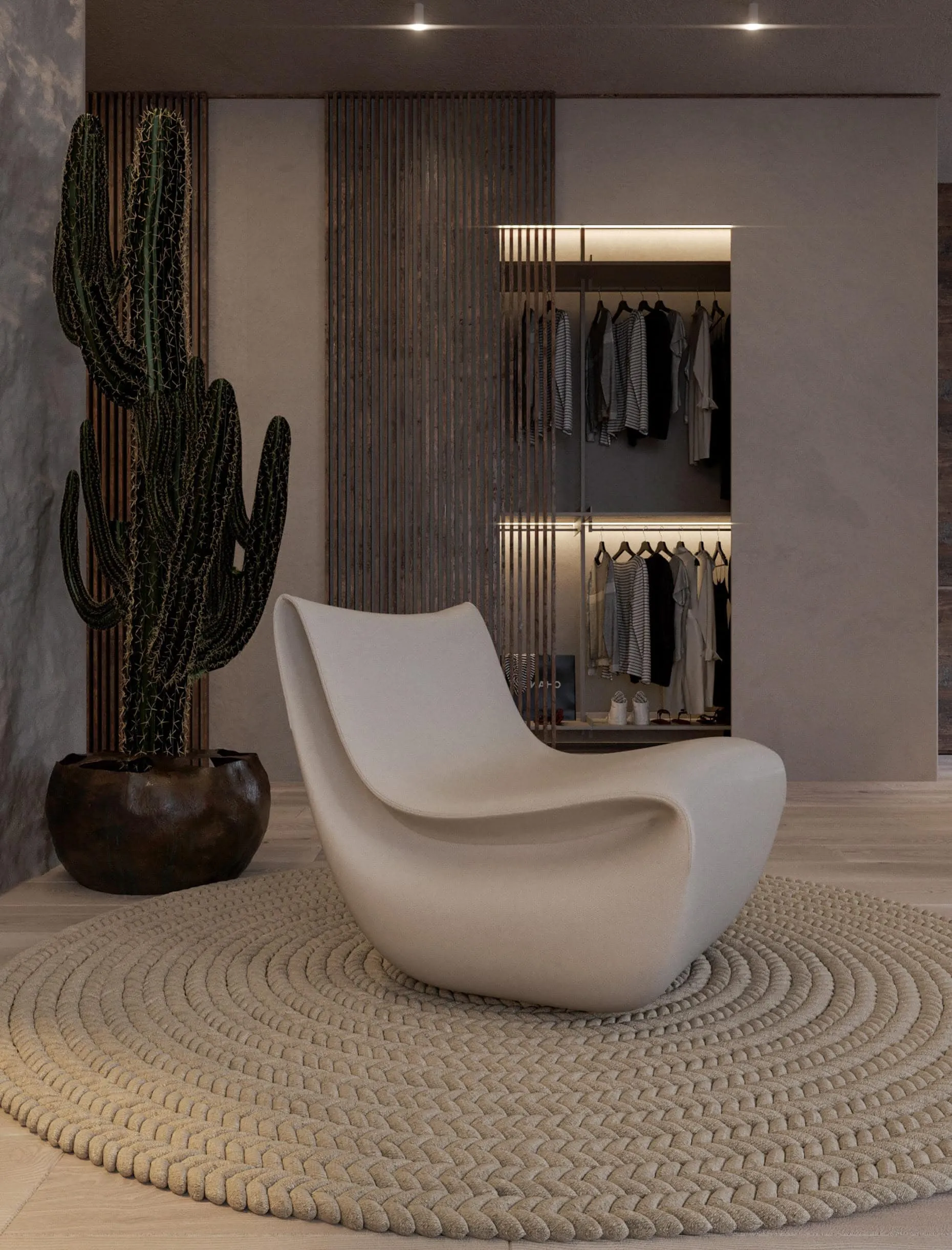 Власниця багато подорожує, особливо любить Таїланд і Шрі-Ланку. У цих країнах є тенденція поєднувати сучасність з традиціями, і ми зробили те саме в інтер’єрі. Незважаючи на цілком природні та сільські відчуття, квартира обладнана високотехнологічними зручностями, які гарантують комфортне життя. Це як бунгало з дерева, глини, льону і всього натурального. Світло ручної роботи є важливою частиною кожного проекту студії MAKHNO. Вабі Сабі шукає простоту і гармонію з природою. Як результат, для освітлення були використані прості необроблені матеріали, а основний акцент в інтер’єрі зроблено на текстурах.