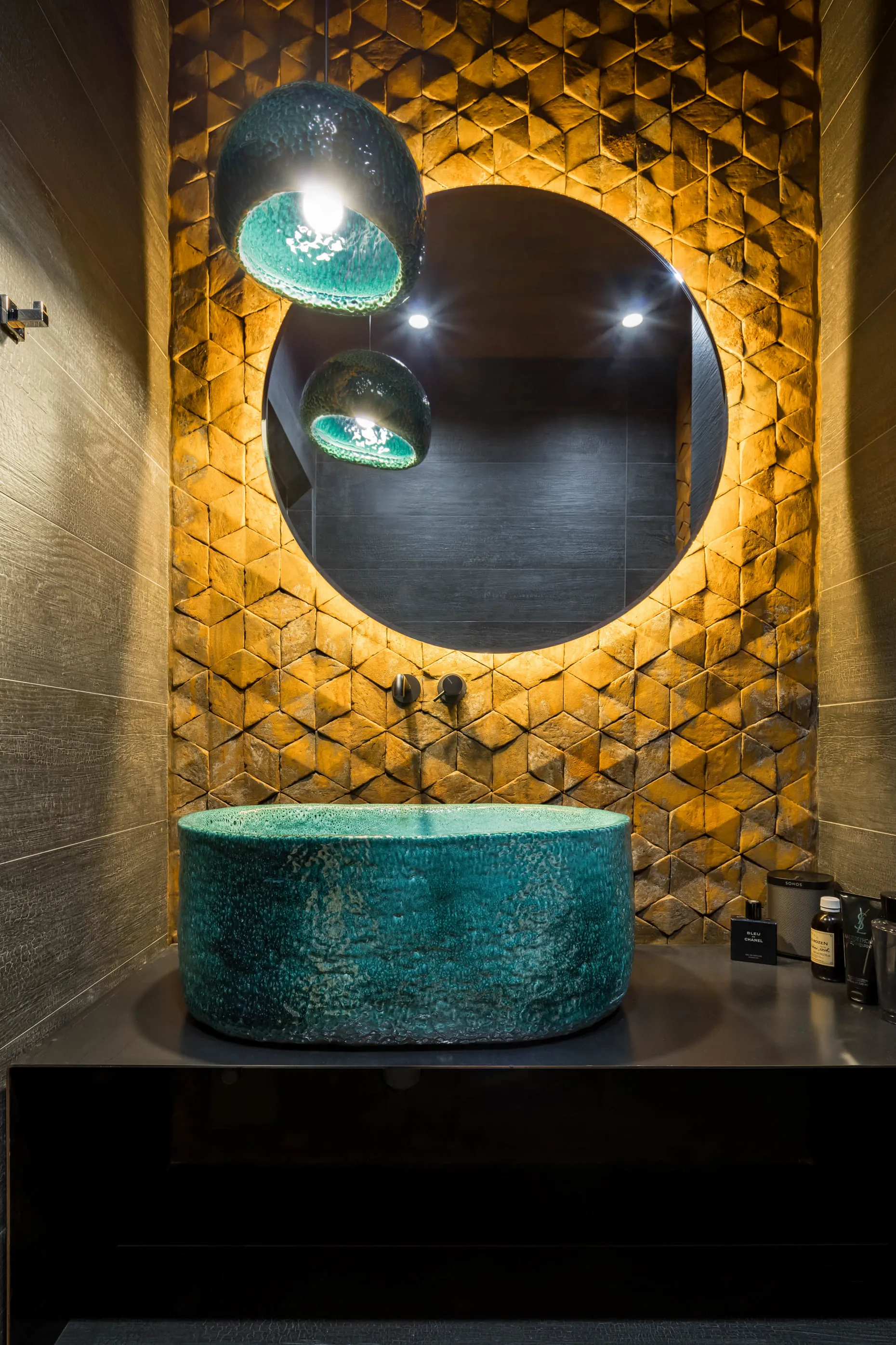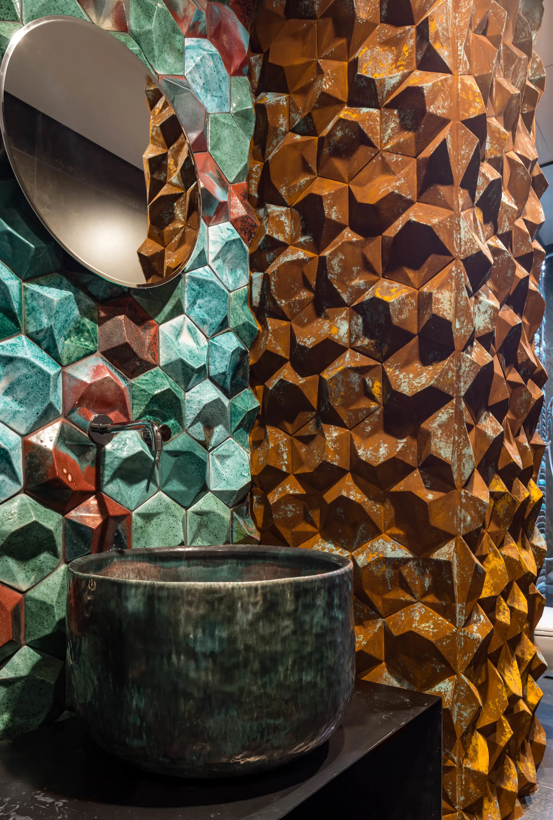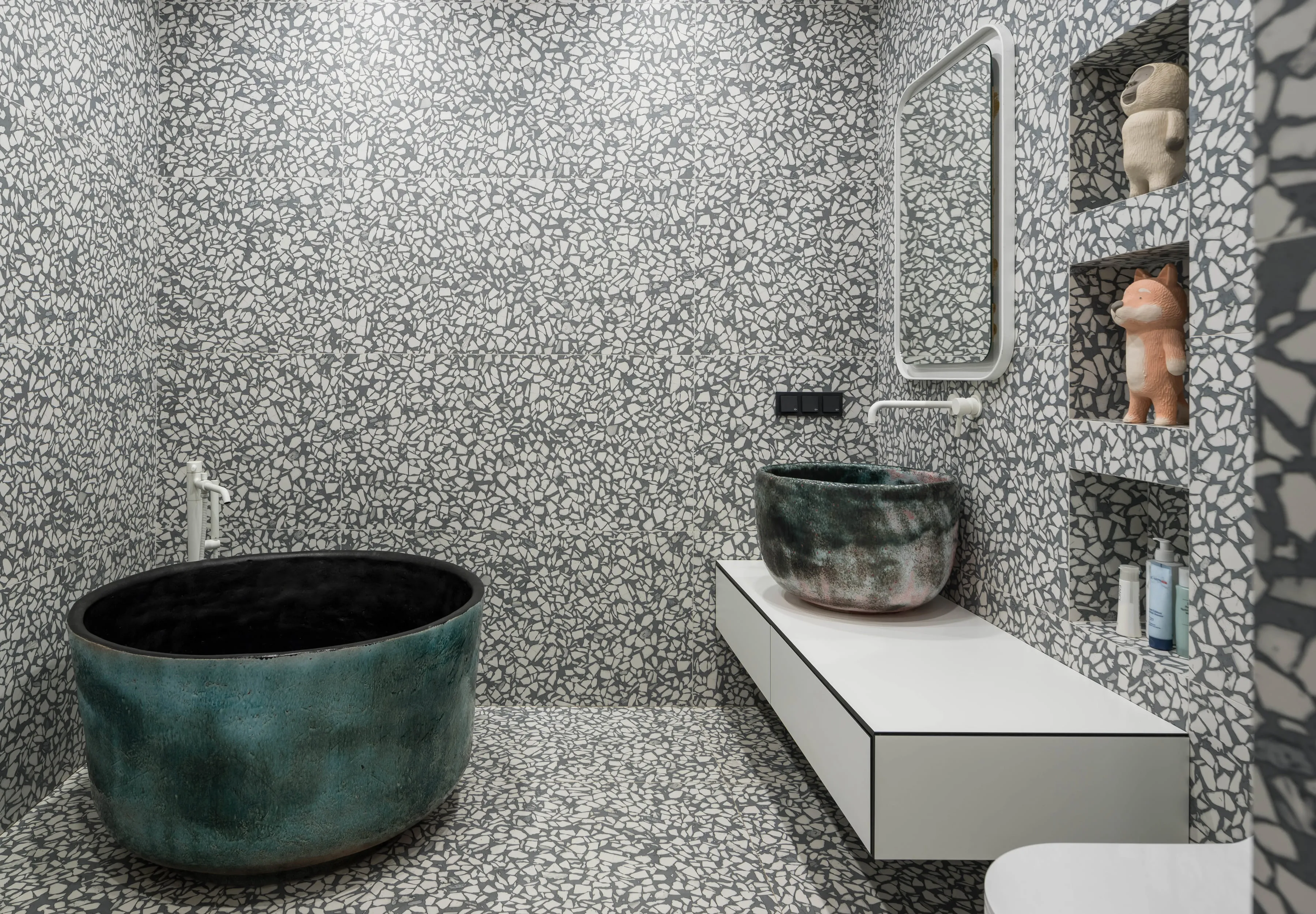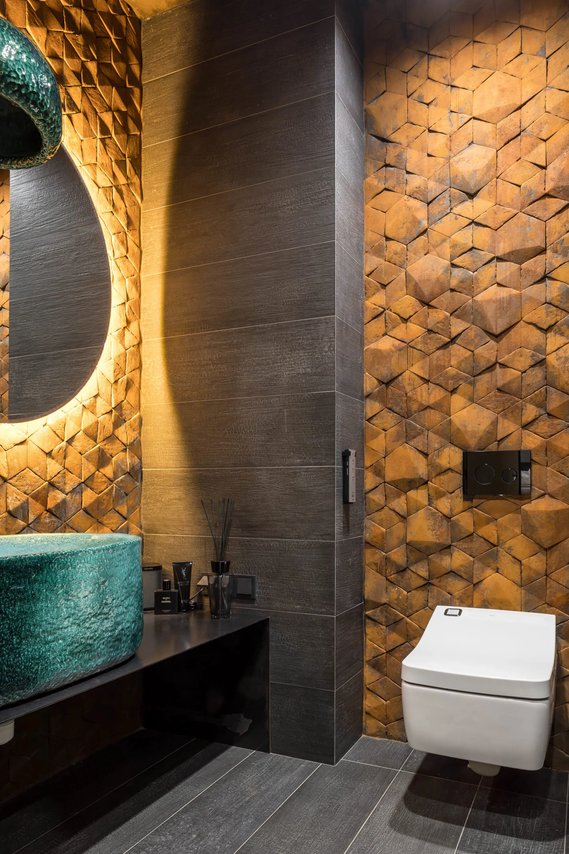 І вперше наш FLAPJACK, що отримав Red Dot Design Award 2017, виконаний у цьому кольорі. І здається, йому пасує. Гостьовий санвузол — галерея авторської плитки від Сергія Махна. Тут наші GRASS, і EARTHQUAKE у двох виконаннях: зі звичайною глазур’ю та металізовані.