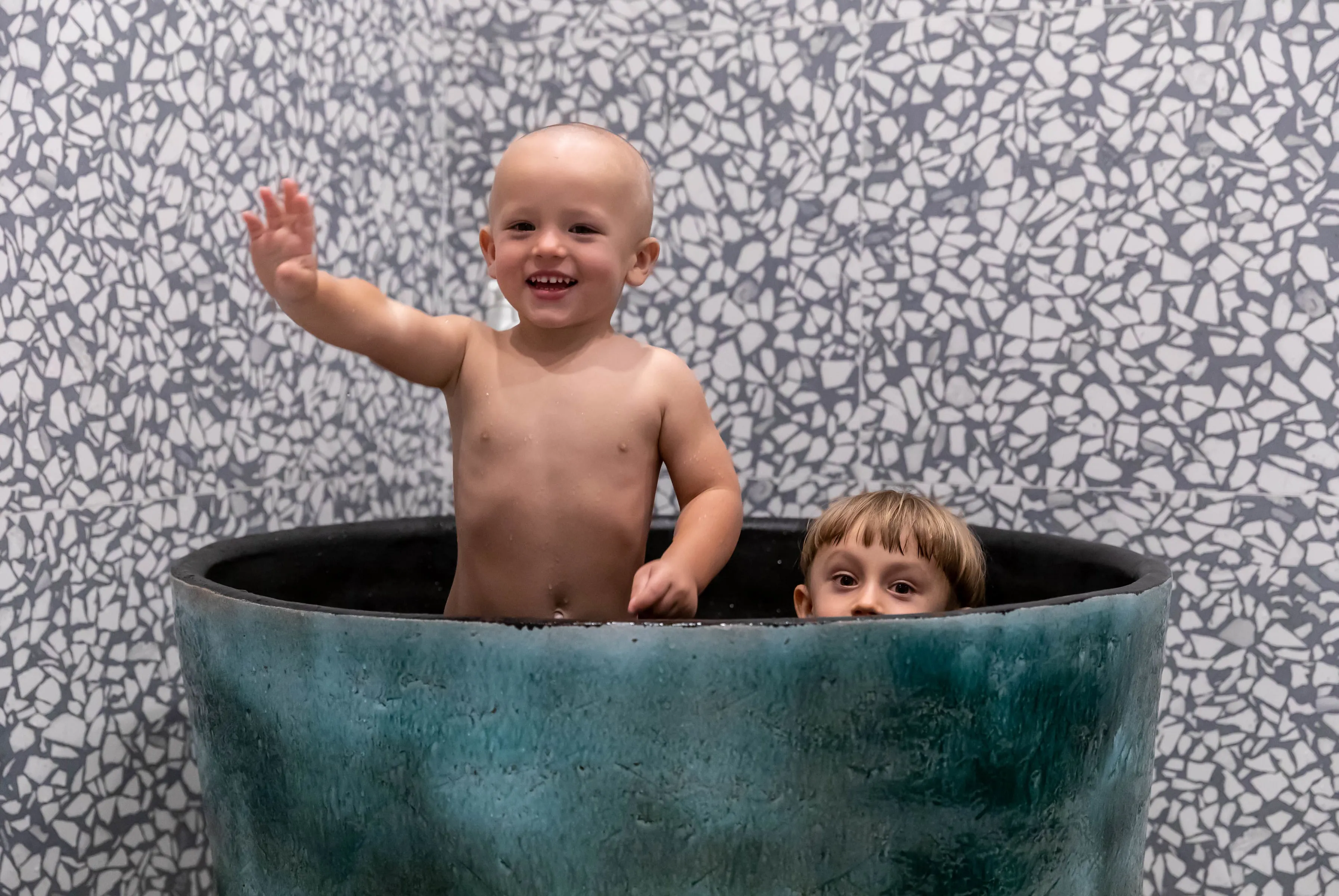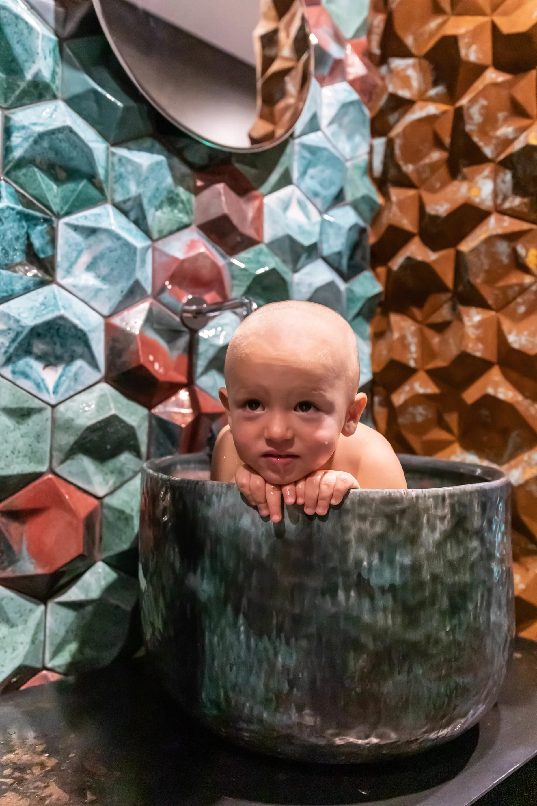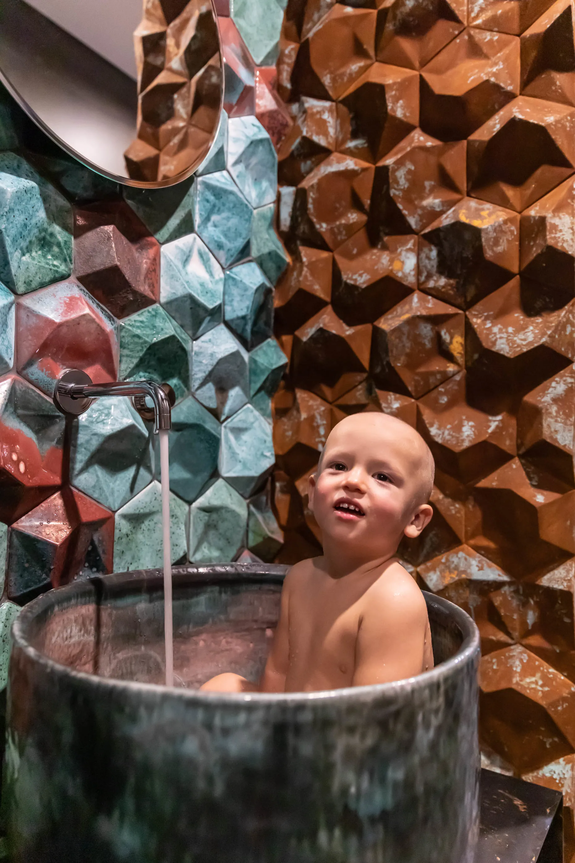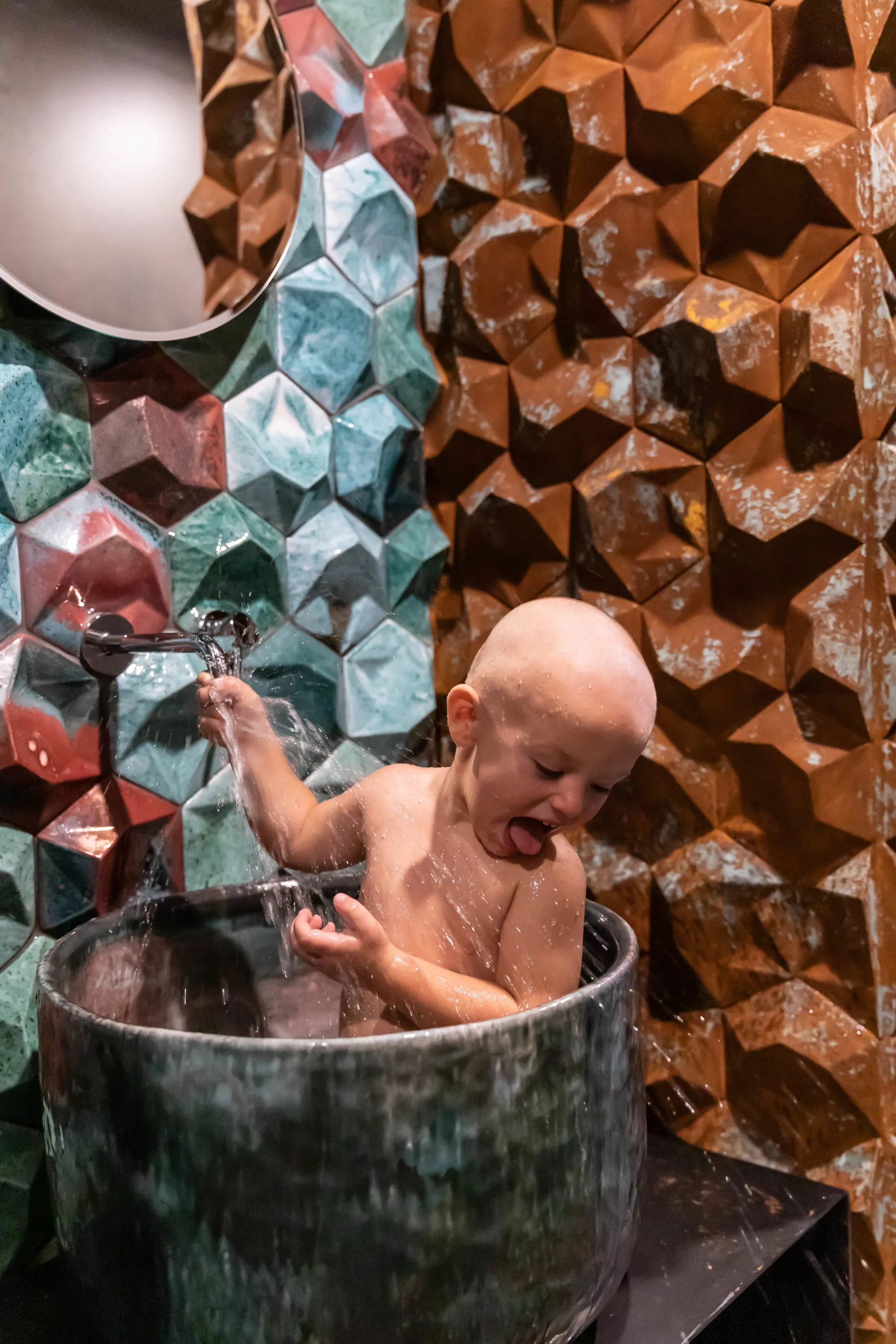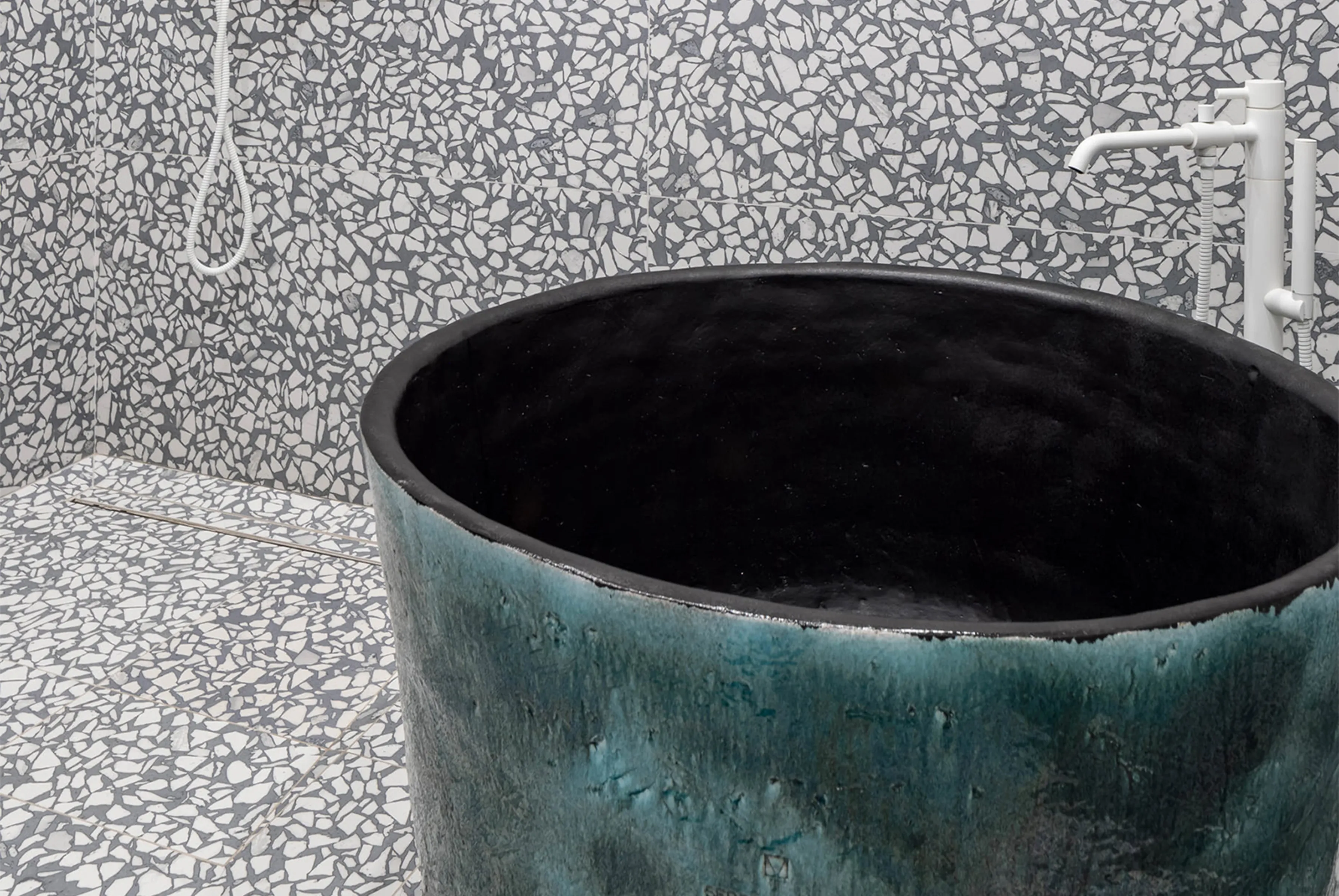 І вперше наш FLAPJACK, що отримав Red Dot Design Award 2017, виконаний у цьому кольорі. І здається, йому пасує. Гостьовий санвузол — галерея авторської плитки від Сергія Махна. Тут наші GRASS, і EARTHQUAKE у двох виконаннях: зі звичайною глазур’ю та металізовані.