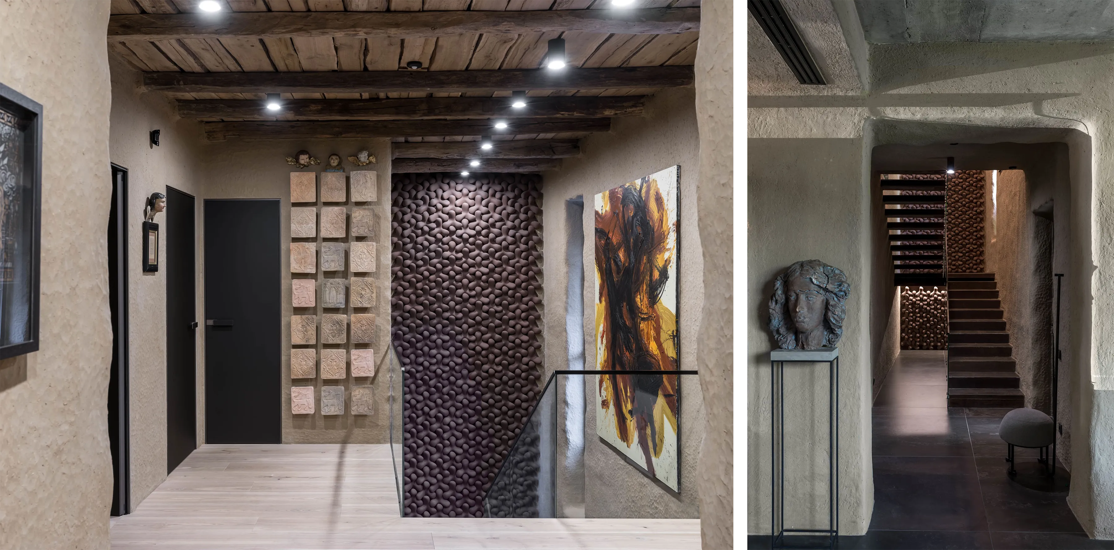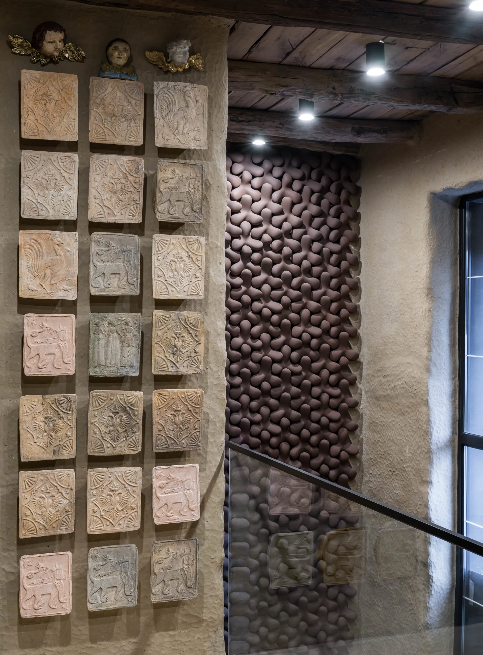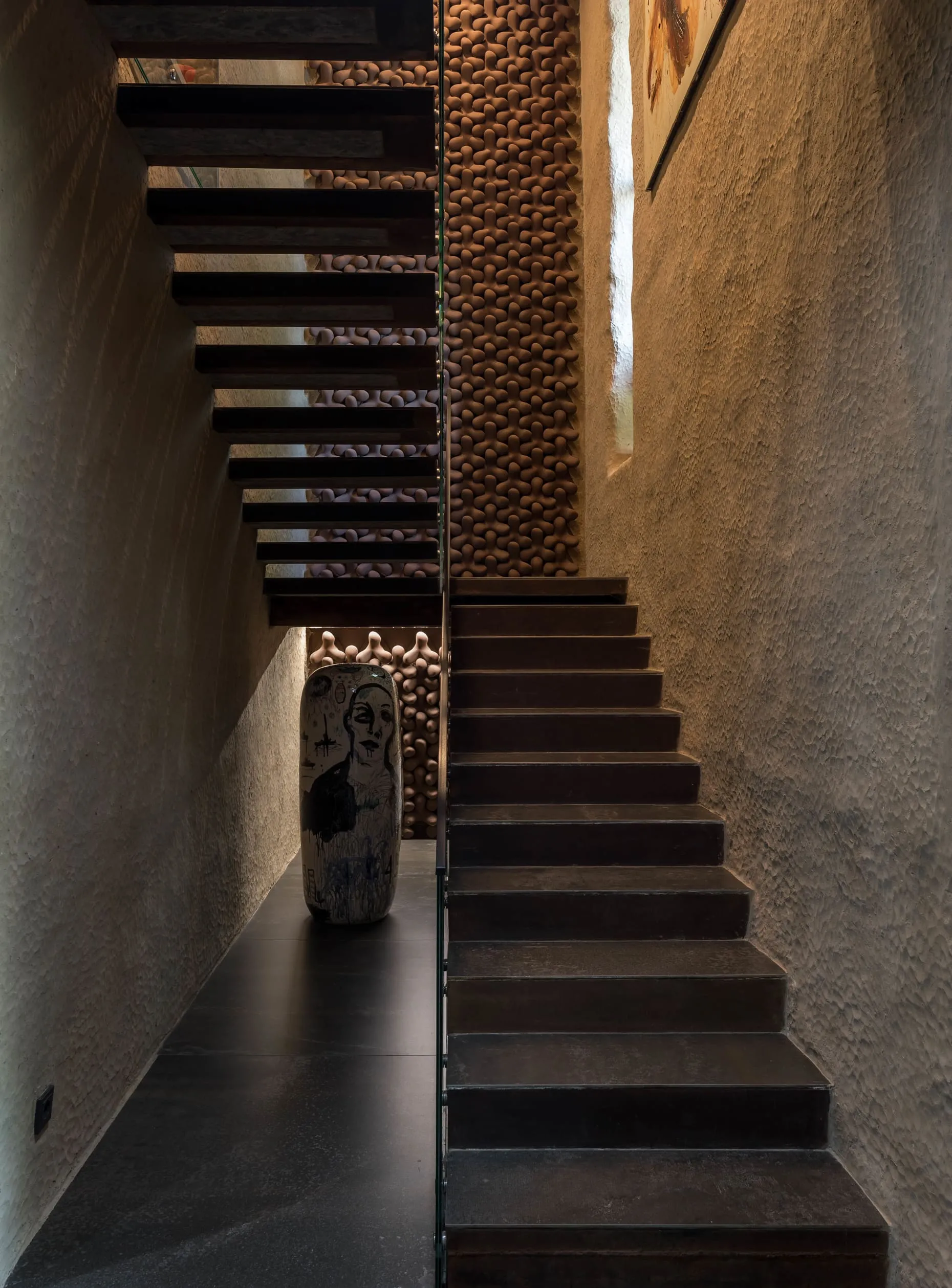 Сходи на другий поверх тримають скляні поручні та руді TETRAPODS — авторську плитку MAKHNO Studio, на створення якої нас надихнули кількатонні тетраподи, що захищають береги від руйнівних хвиль.