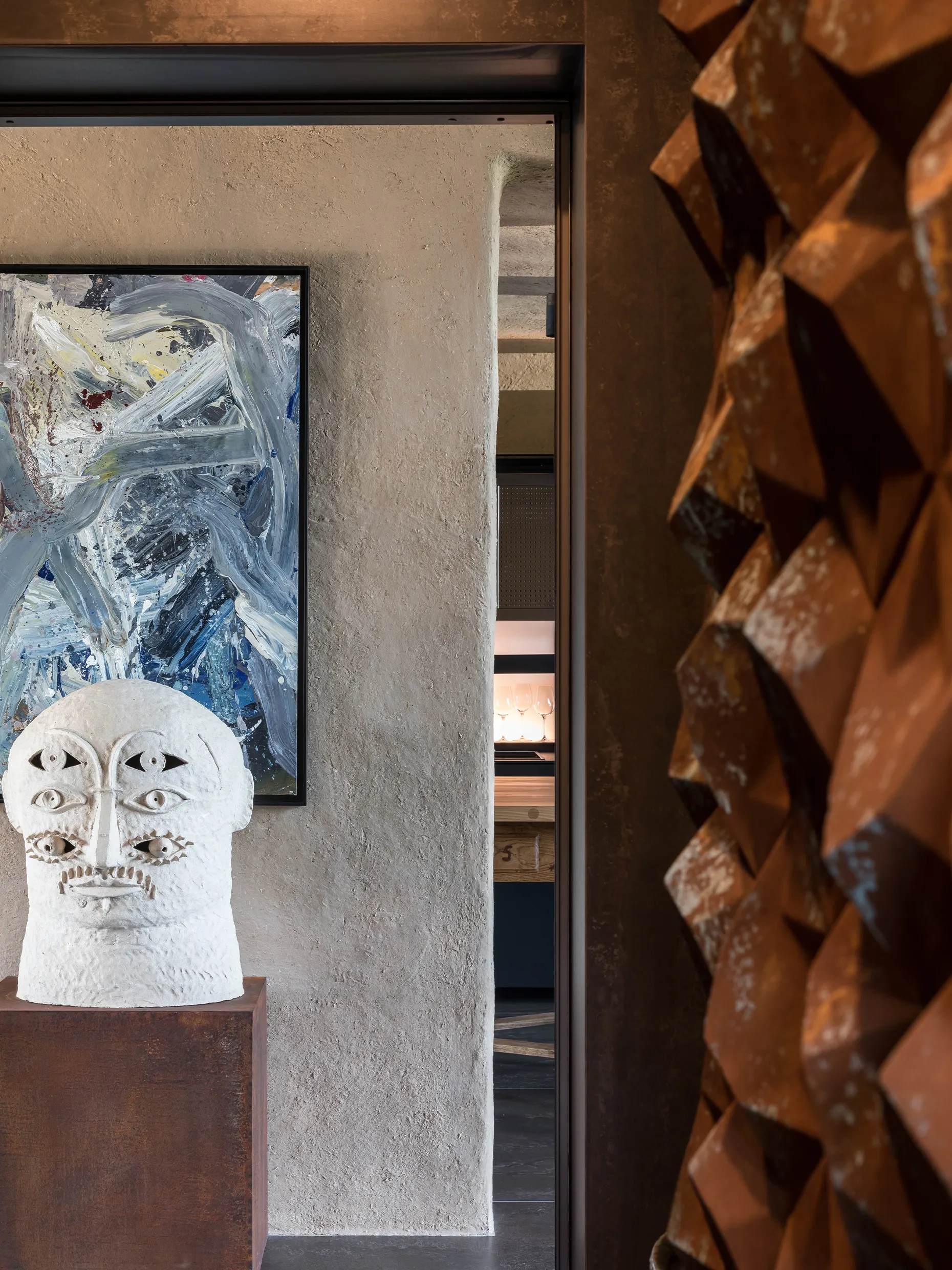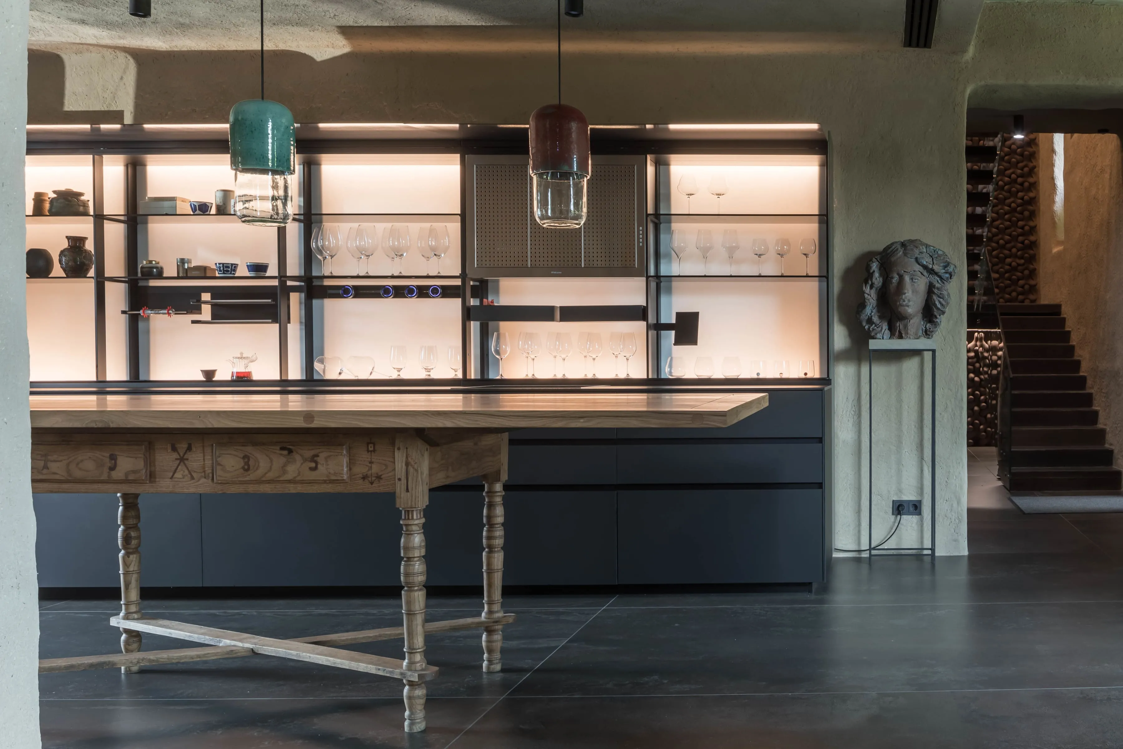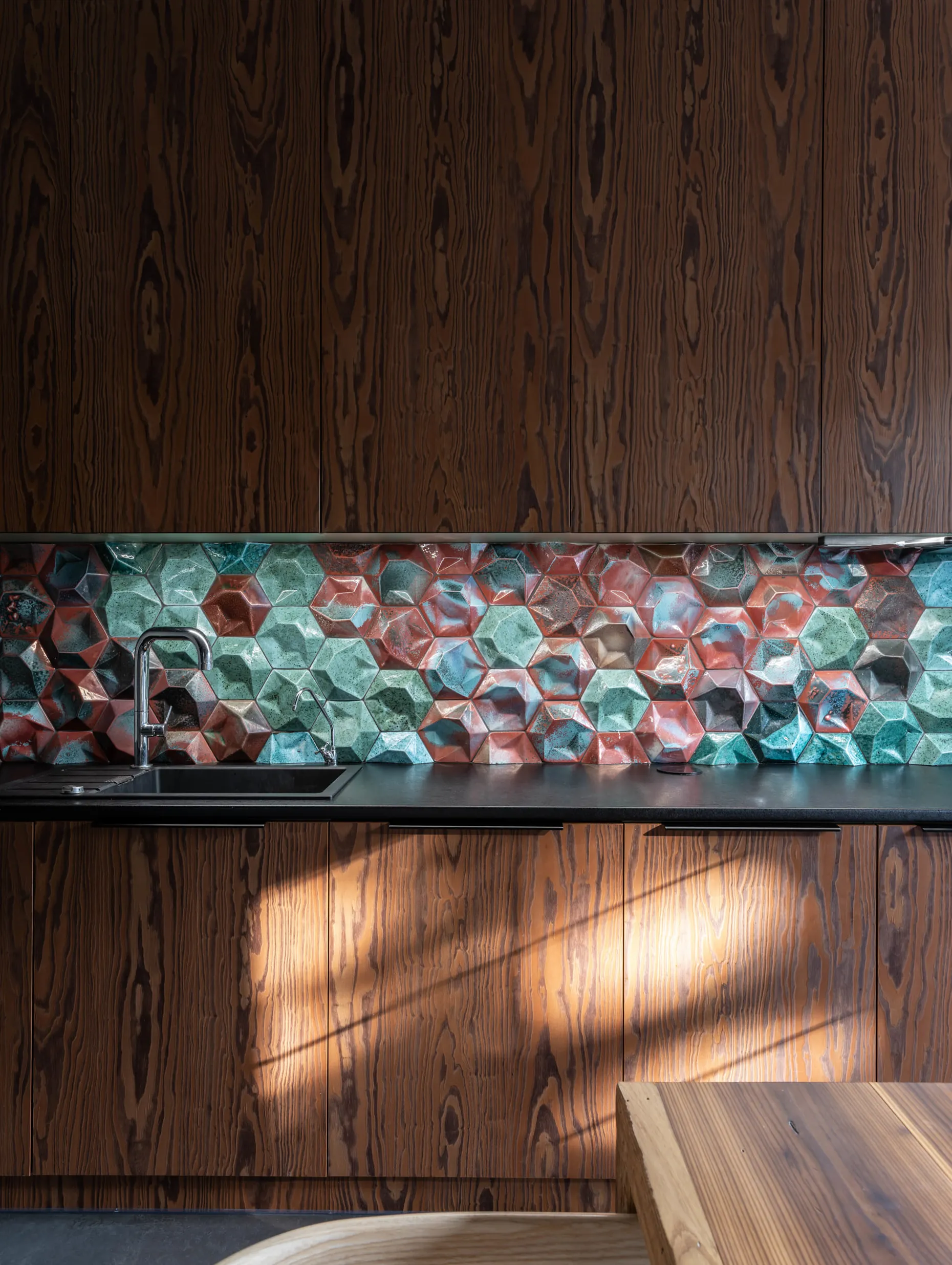 Сходи на другий поверх тримають скляні поручні та руді TETRAPODS — авторську плитку MAKHNO Studio, на створення якої нас надихнули кількатонні тетраподи, що захищають береги від руйнівних хвиль.