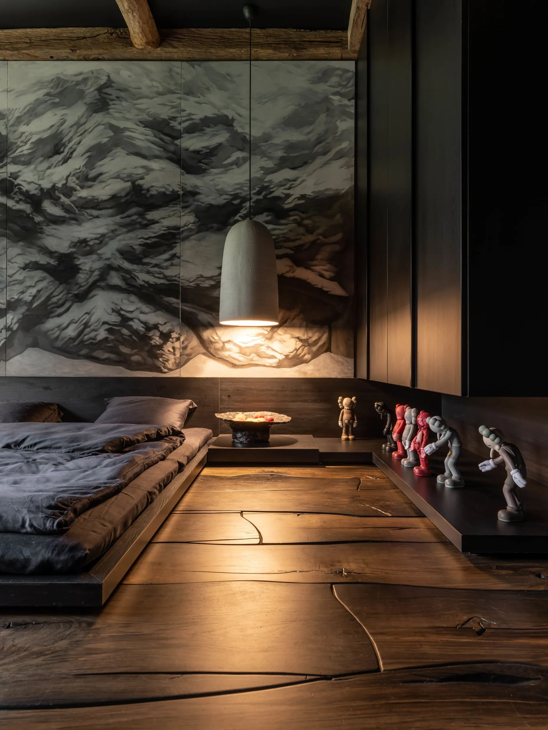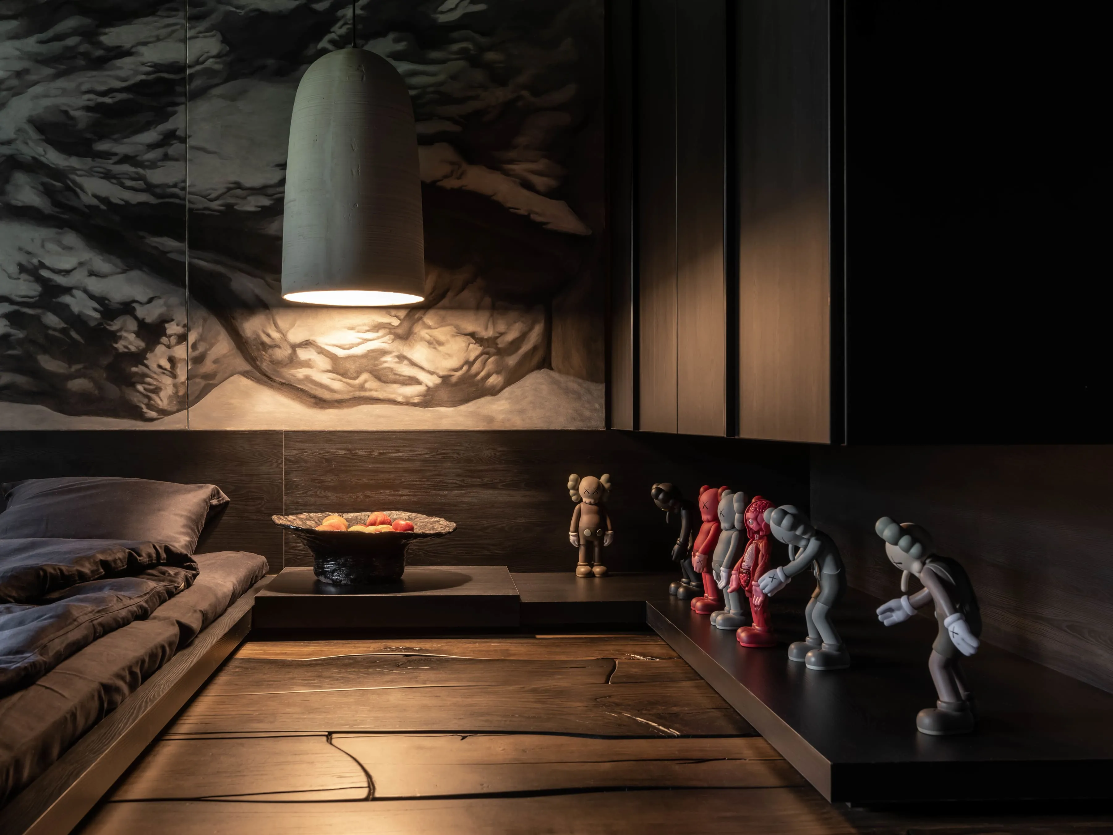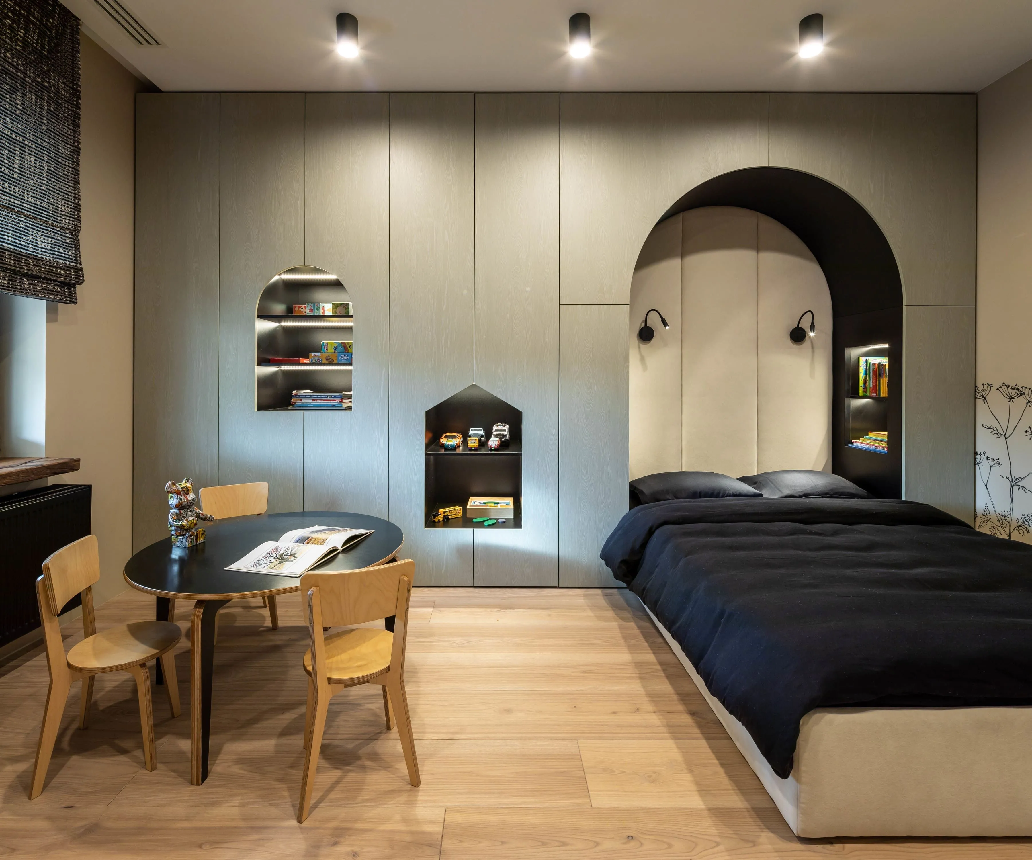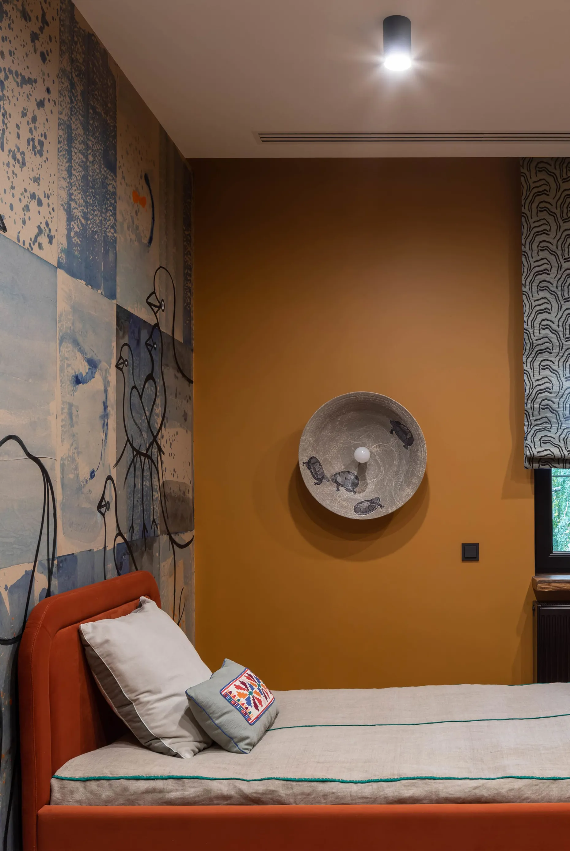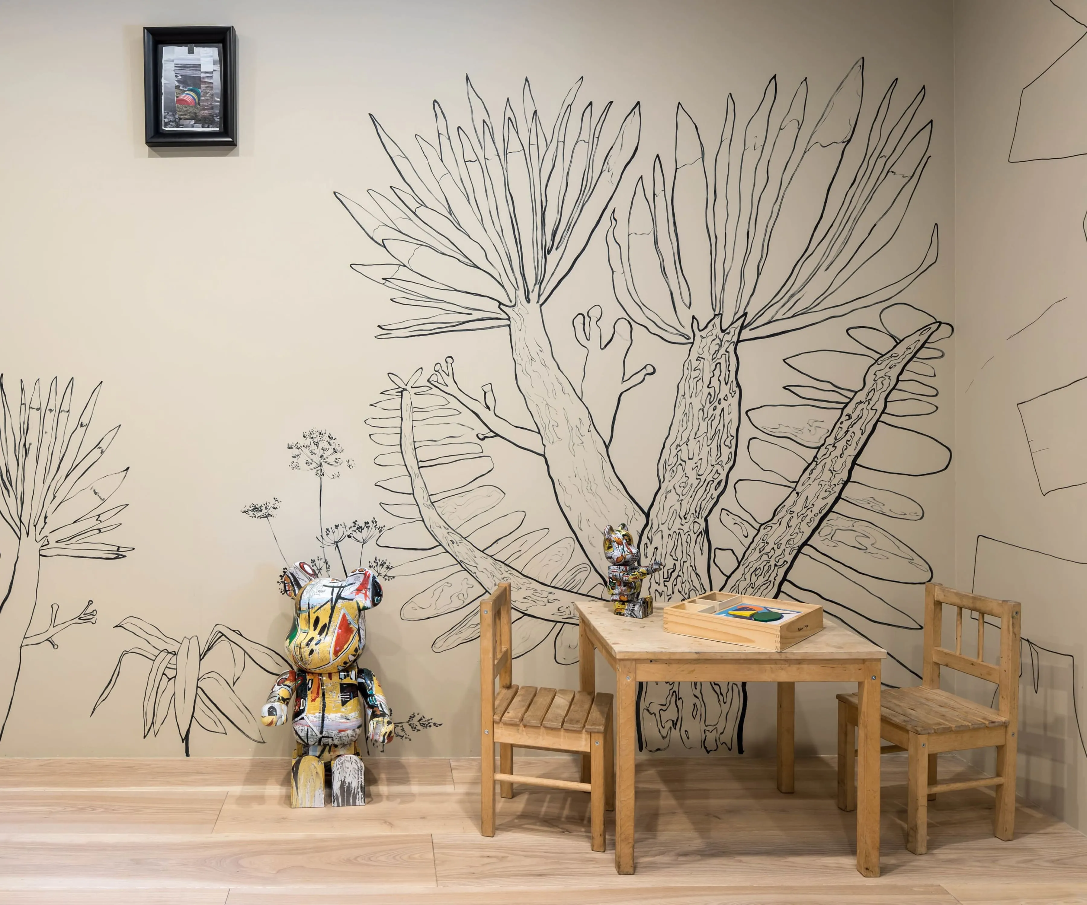 Це дуже важлива кімната в домі. Тут запускатимуть ракети в космос і перемагатимуть піратів. Тут будуть знаходити скарби й ховати свої так, що не знайде навіть мама. Сюди притягнуть з вулиці кошеня. А ще замастять стіни зеленкою, і, можливо, відірвуть Kaws-у вухо. Розпис на стінах, до речі, виконав Сергій Махно. Він малює з дитинства, і досі більшість його авторських речей спочатку з’являються на папері.