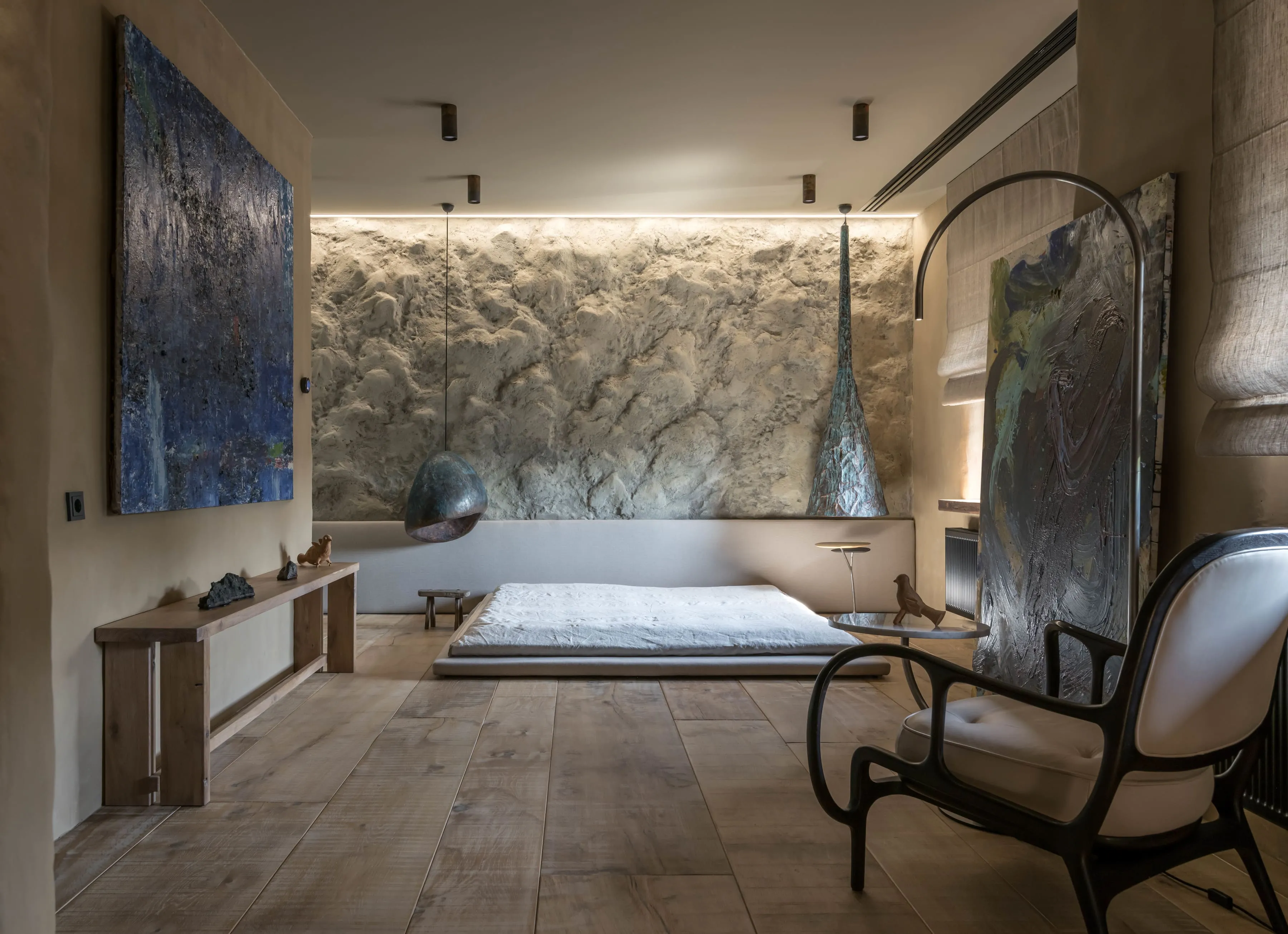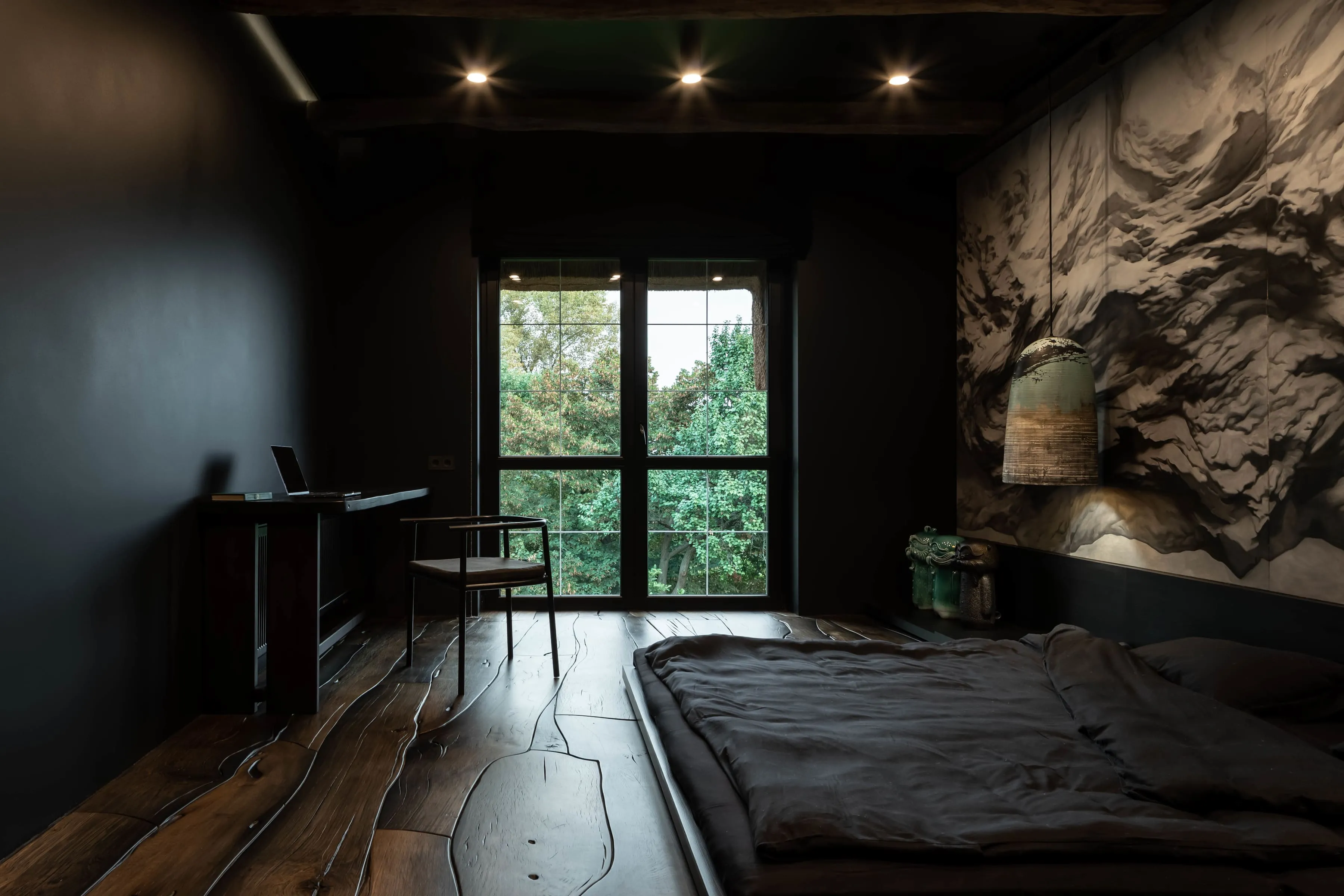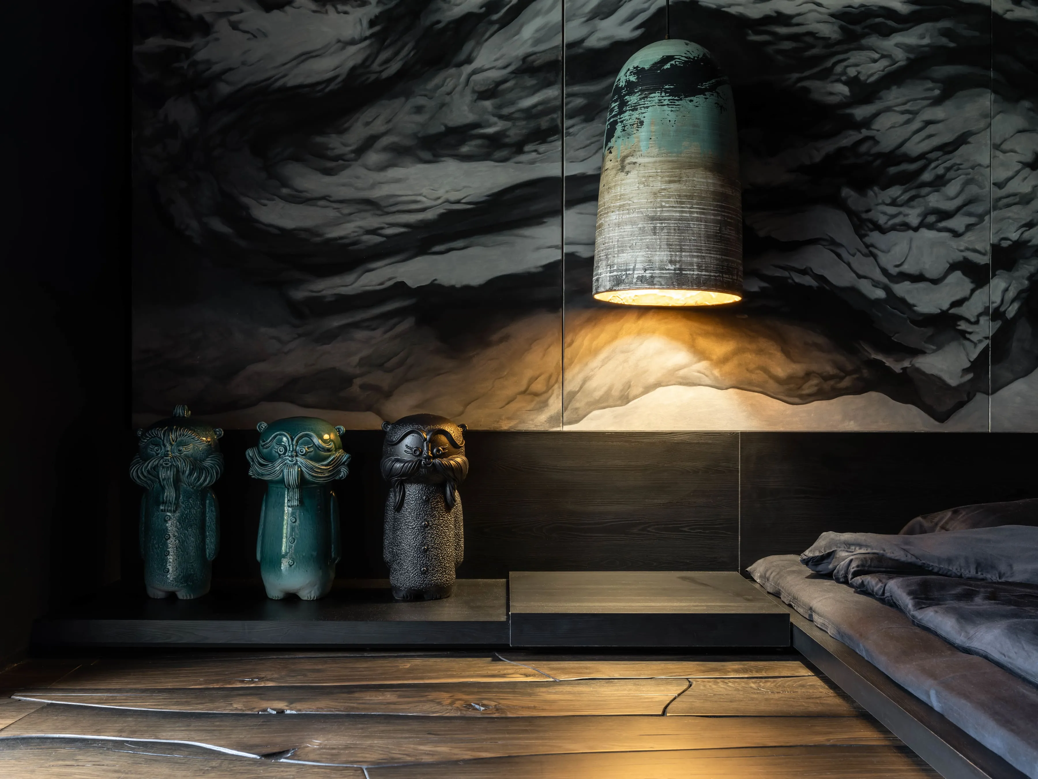 В узголів’ї ліжка-татамі — традиційний для філософії вабі-сабі монохромний живопис в стилі Сумі-е — відсторонені, далекі пейзажі, ніяких золотих рам.
