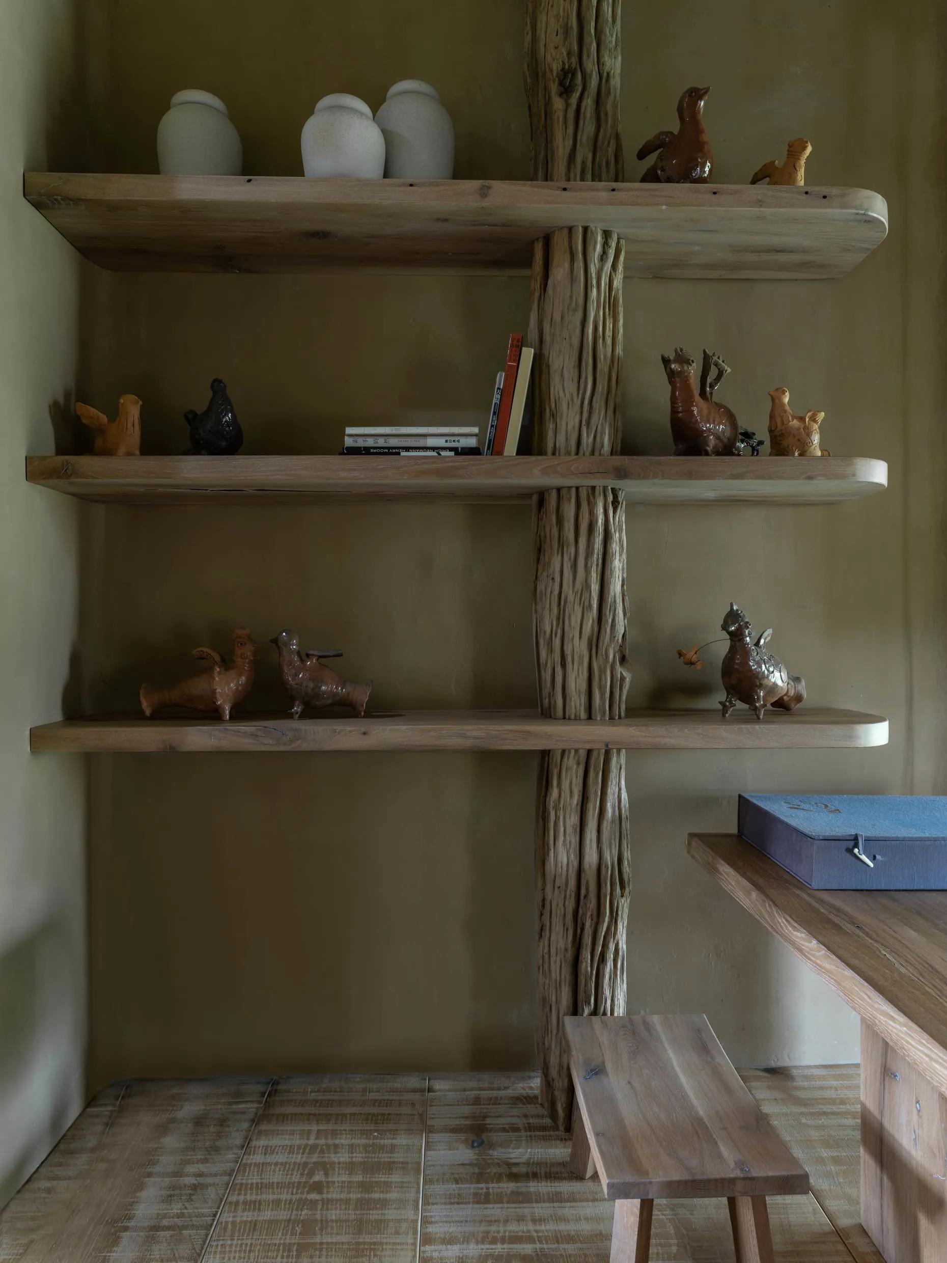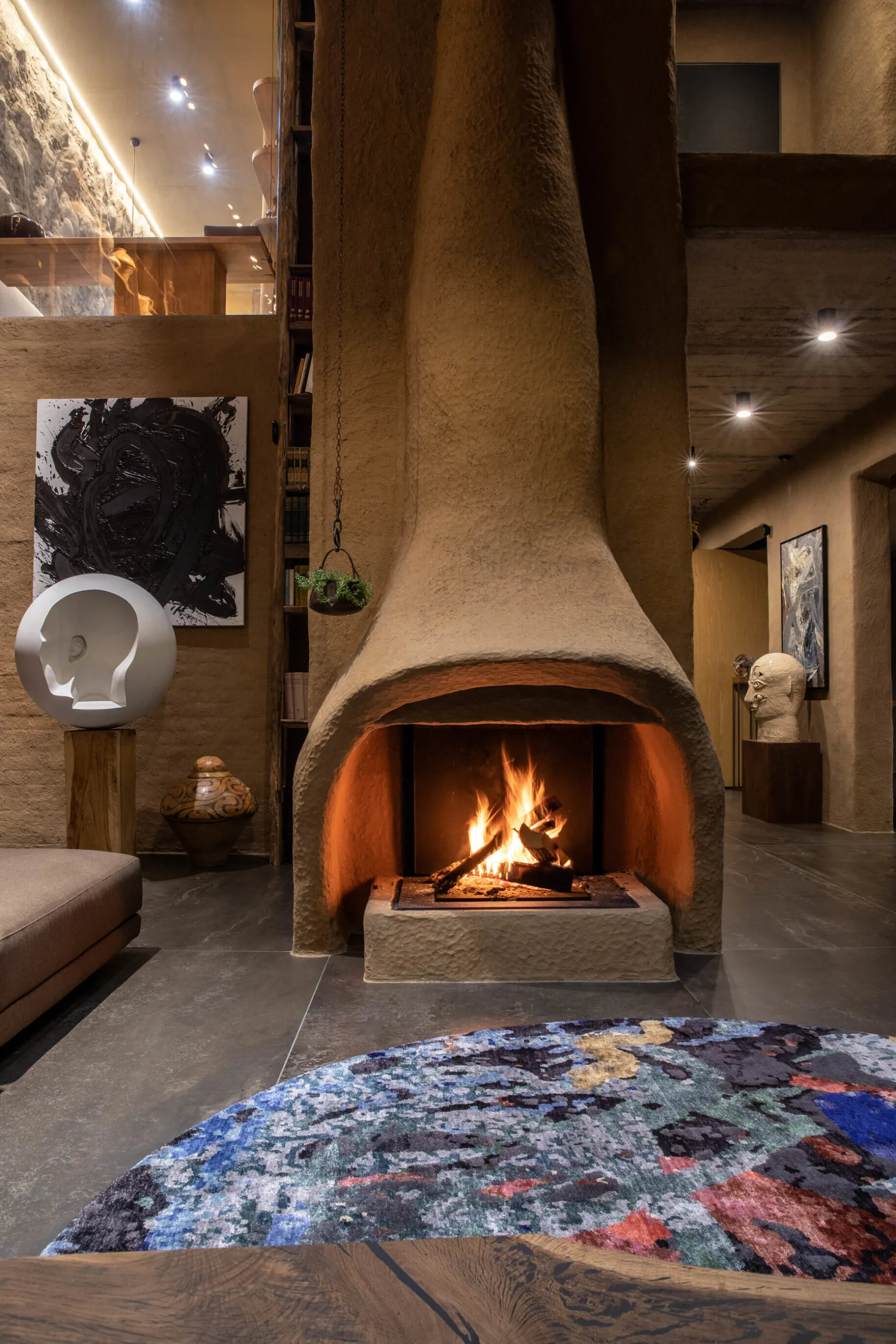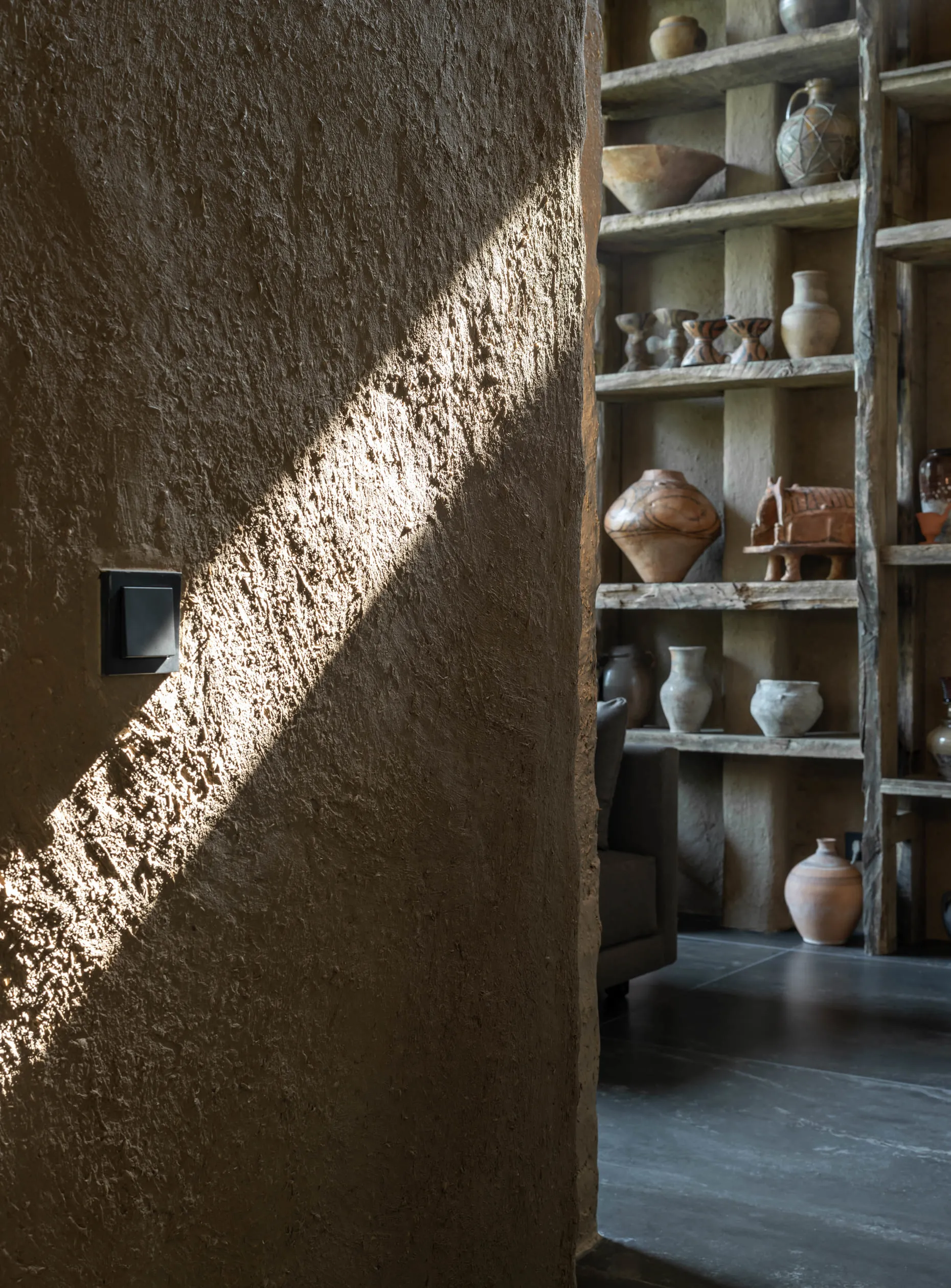 Глина. Тут є декілька сортів української глини. Стіни оздоблені у дев’яти техніках. Одна з них, наприклад, зазвичай використовується для створення керамічних скульптур. Щоб отримати текстуру з рівномірними ум’ятинами, стіни покрили глиною і били дерев’яною ложкою, доки не засохне. Також за давніми українськими традиціями з глиною змішали насіння льону, жита, пшениці — така техніка використовувалася ще за часів Трипілля.