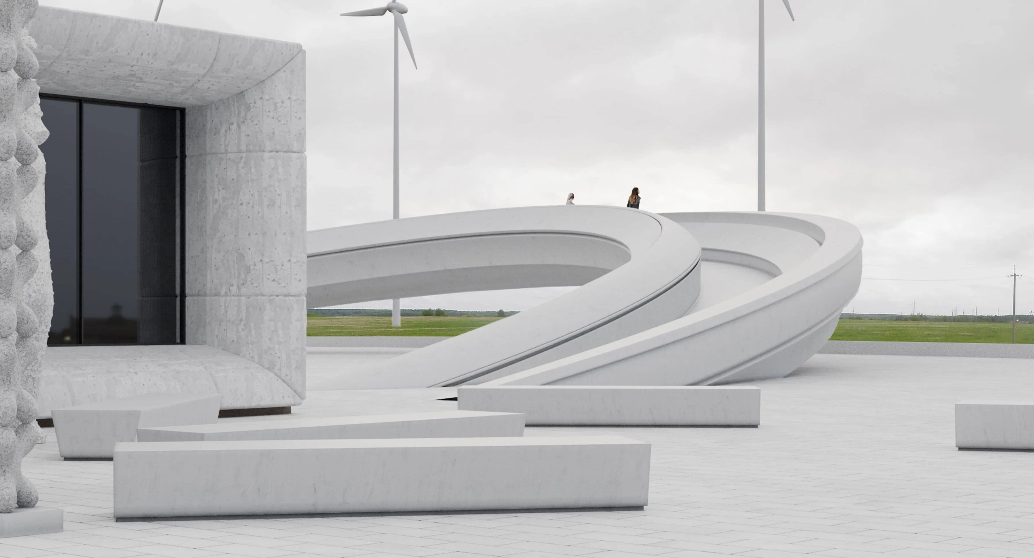 Візит-центр – це двоповерхова будівля, яка складається з музею, конференц-зали, споглядального майданчика на поле з вітряками, відпочинковий простір та зони кафе-бар. Особливістю ландшафту є кругле озеро позаду будівлі, над яким розмістився споглядальний майданчик з видом на вітряки. Для цілісності будівлі та ландшафту було обрано білий колір – як основна лінія, що проходить через поле з вітряками та завершується новим візит-центром. Основний блок – музей, спроєктований у формі крила, що у відображені озера поблизу нагадує конструкцію вітряка. Задля підкреслення горизонтальної форми основного блоку, на який спирається архітектурна форма у вигляді крила, було продовжено візуальну композицію новими кватроподами, унікальною 3д плиткою MAKHNO Studio.