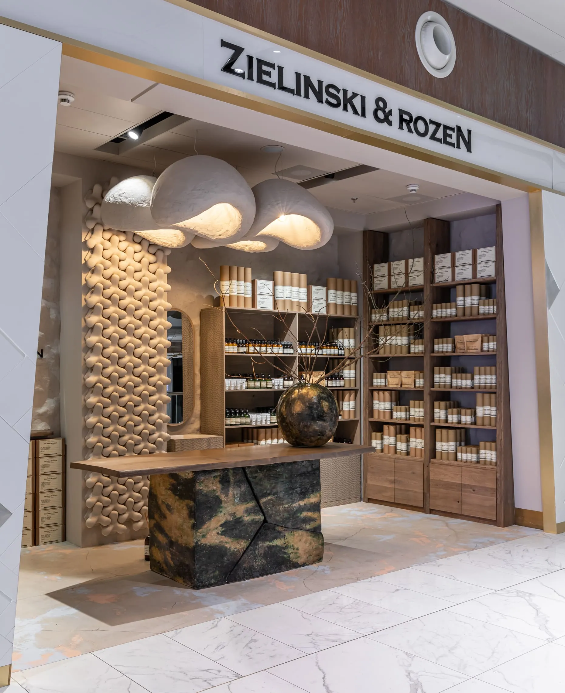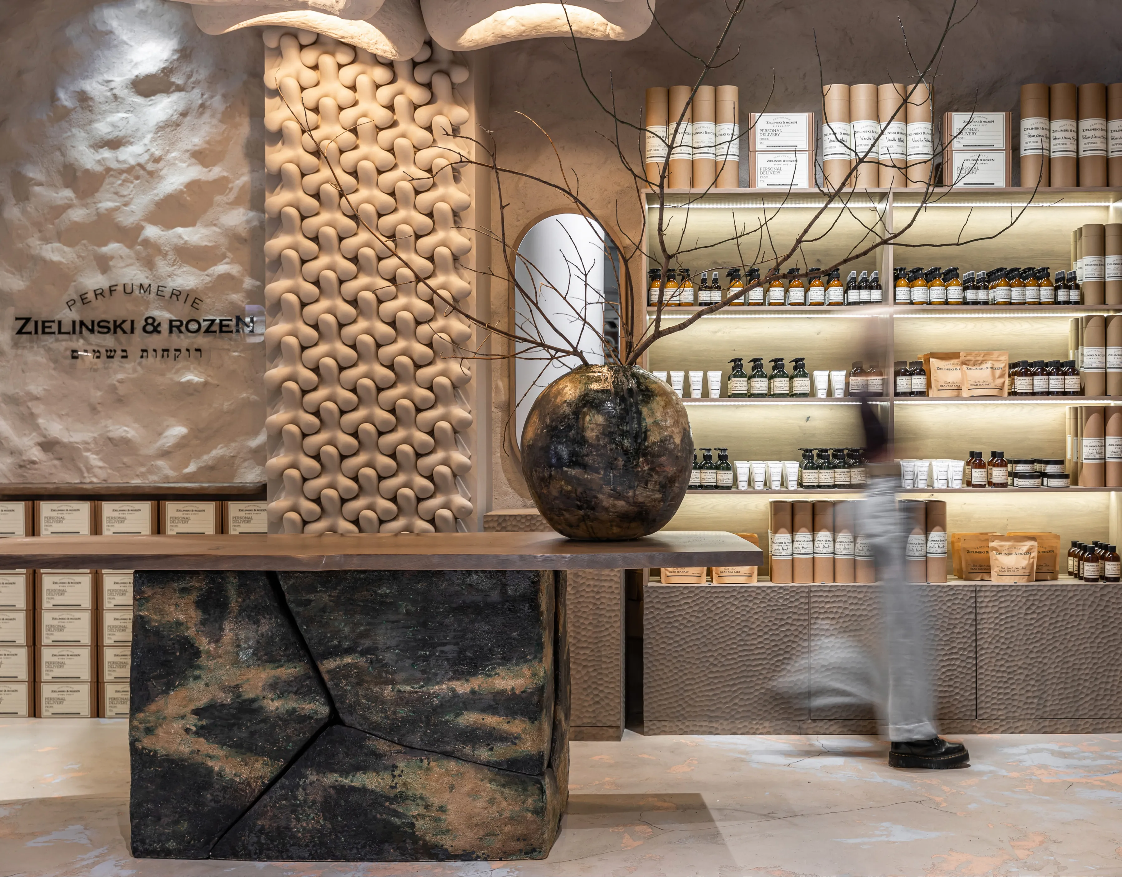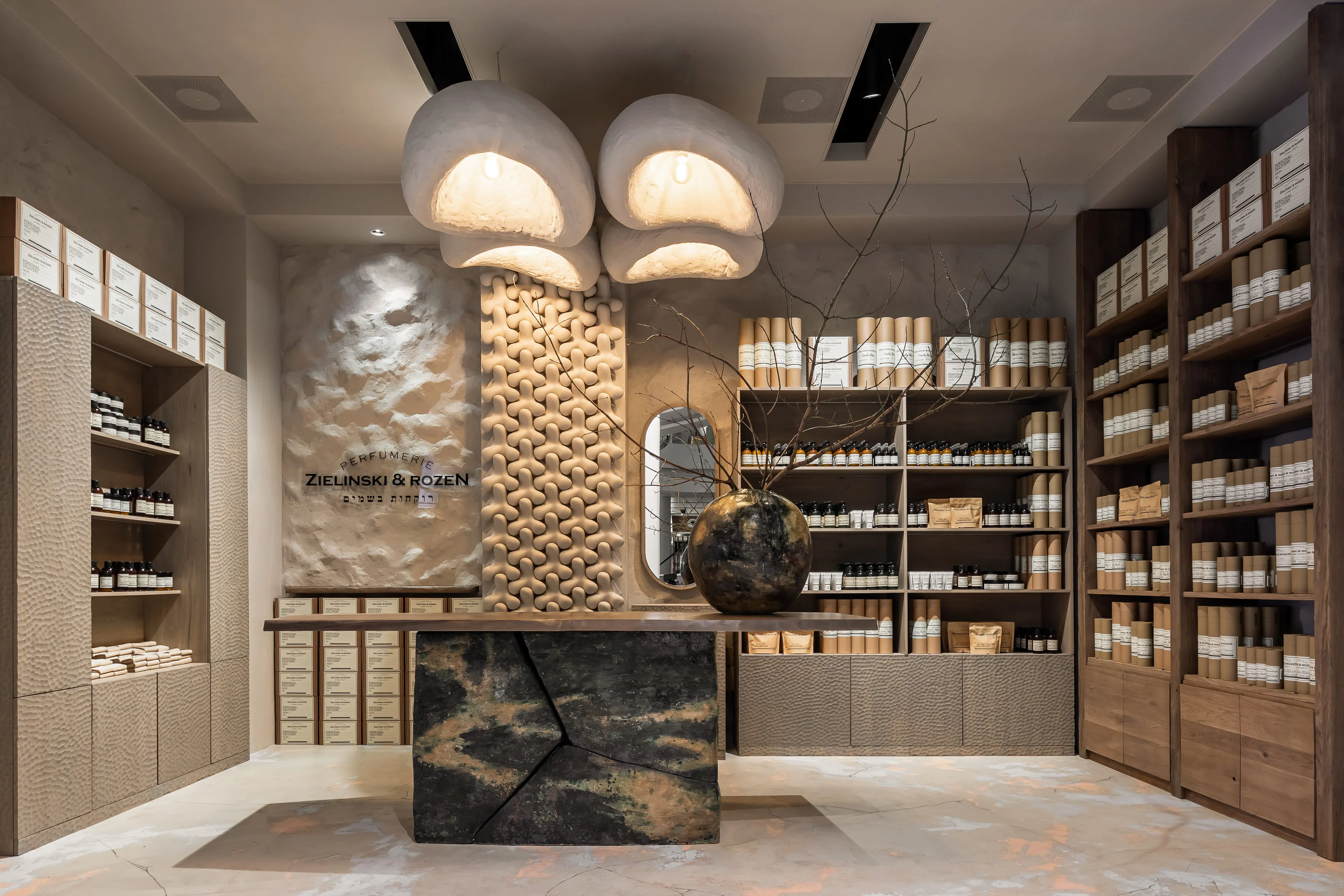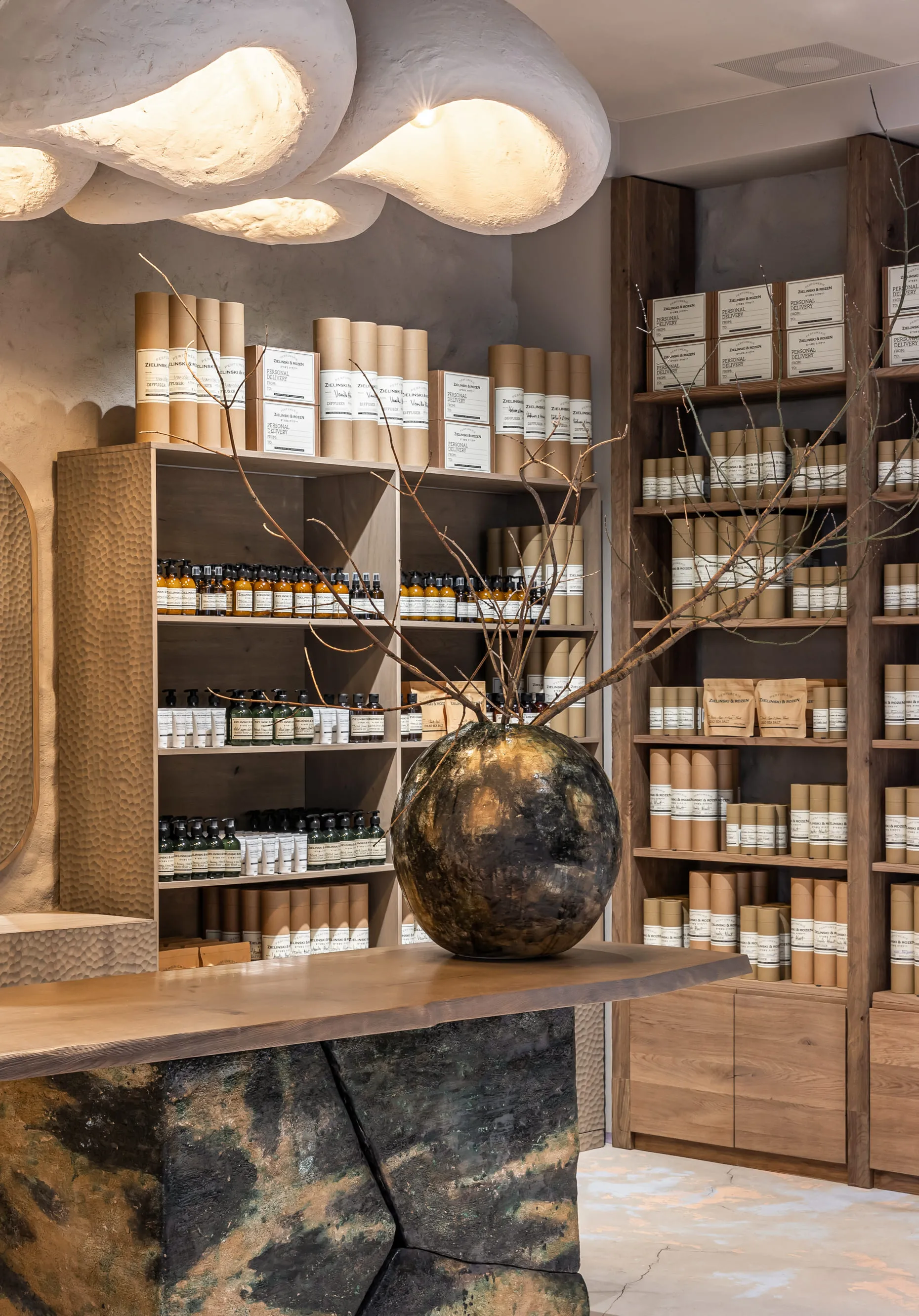 В інтер’єрі домінують природні матеріали, типові для української культури, — кераміка та дерево. В центрі композиції — стіл, для якого ми виготовили стилізовану керамічну опору з тріщинами. Ваза від Махно доповнює колірну фабулу стола. По обидва боки від головного острівця розташувалися дерев’яні полиці з парфумерією. Всі стіни оздоблені декоративною штукатуркою — це сучасна версія техніки, що використовувалась за часів наших дідів-прадідів. Основну зі стін прикрашає 3D-плитка Tetrapod, яка виграла міжнародну премію Red Dot Design Award у 2017 році. М’яких акцентів додають білосніжні світильники KHMARA, виготовлені в нашій керамічній майстерні. Корнер Zielinski & Rozen у Києві — це нагода поринути у світ неймовірних ароматів, що оповитий натуральними матеріалами та давніми українськими традиціями.