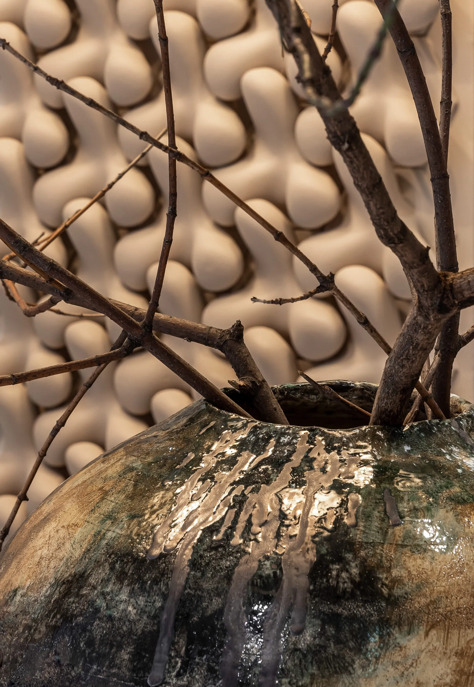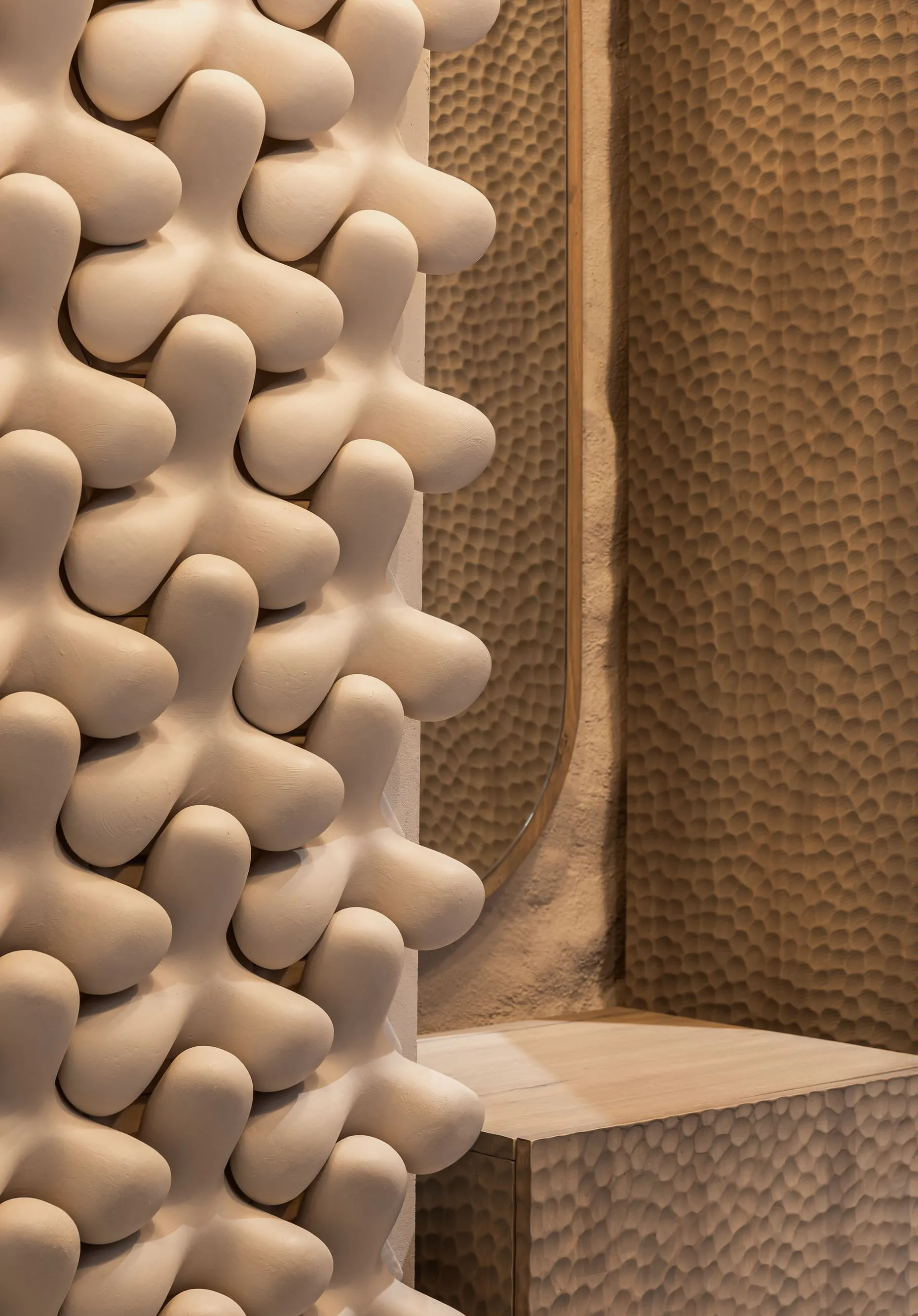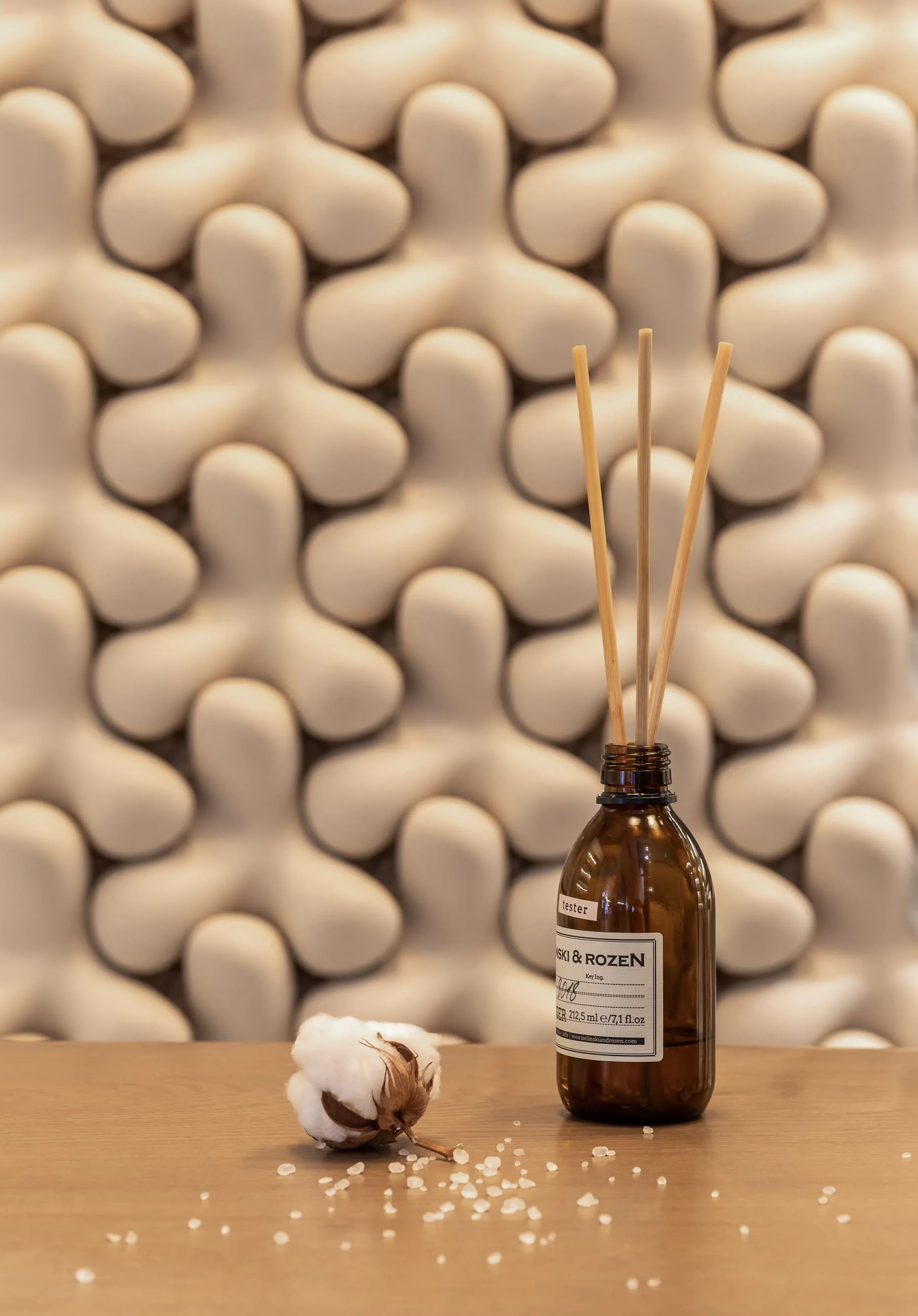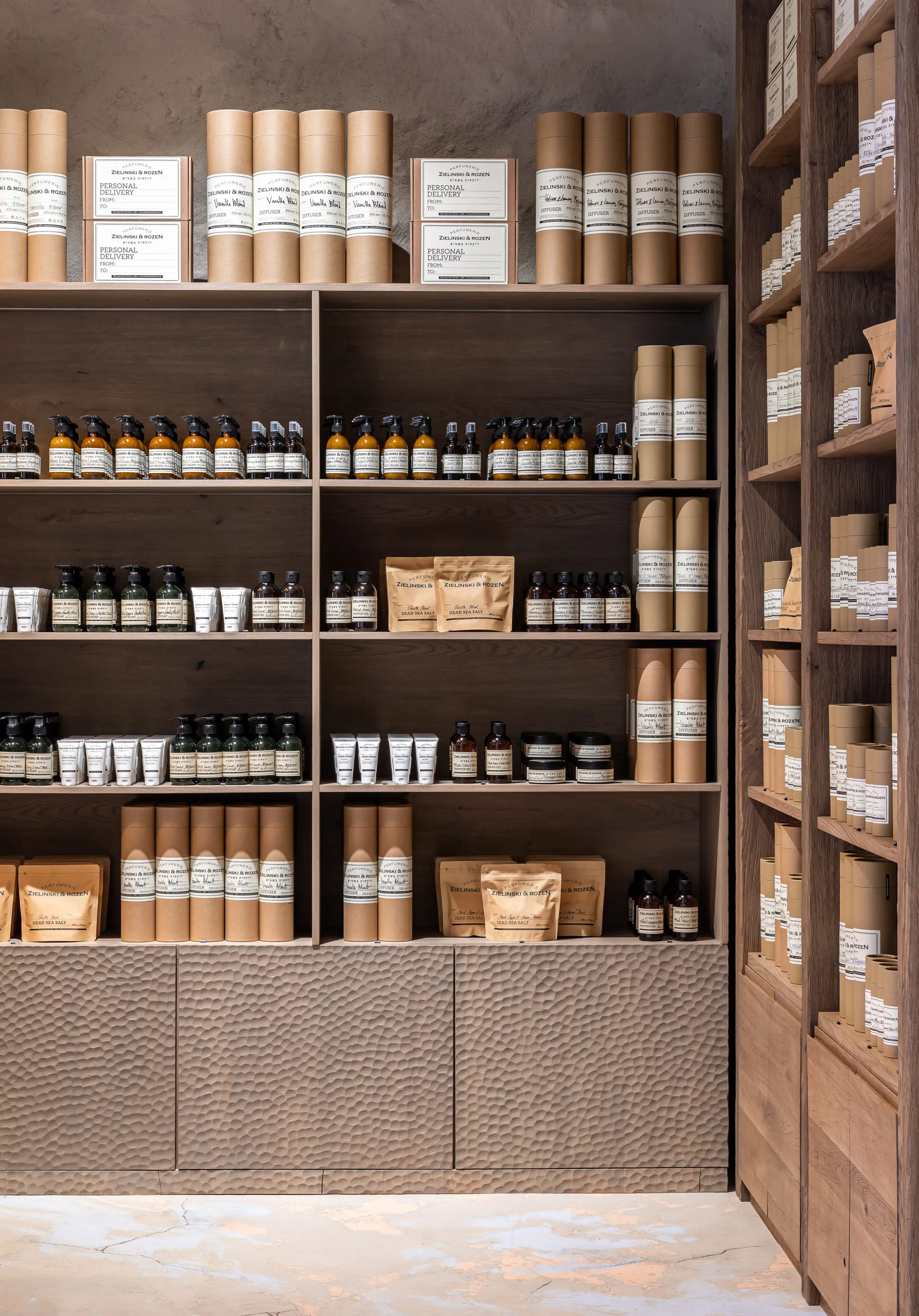 В інтер’єрі домінують природні матеріали, типові для української культури, — кераміка та дерево. В центрі композиції — стіл, для якого ми виготовили стилізовану керамічну опору з тріщинами. Ваза від Махно доповнює колірну фабулу стола. По обидва боки від головного острівця розташувалися дерев’яні полиці з парфумерією. Всі стіни оздоблені декоративною штукатуркою — це сучасна версія техніки, що використовувалась за часів наших дідів-прадідів. Основну зі стін прикрашає 3D-плитка Tetrapod, яка виграла міжнародну премію Red Dot Design Award у 2017 році. М’яких акцентів додають білосніжні світильники KHMARA, виготовлені в нашій керамічній майстерні. Корнер Zielinski & Rozen у Києві — це нагода поринути у світ неймовірних ароматів, що оповитий натуральними матеріалами та давніми українськими традиціями.